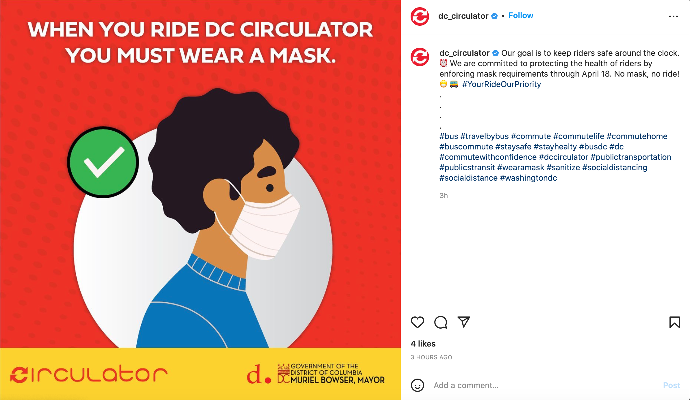 This is an Instagram post by dc_circulator. This is a PSA on why you should wear a mask while riding the DC Circulator. In the caption, it says that there will be no ride if there is no mask. This PSA is meant for people living in Washington DC and use the public transit there. While some places around the US have been lifting restrictions, the US Capitol still has many in place, at least for public transportation.