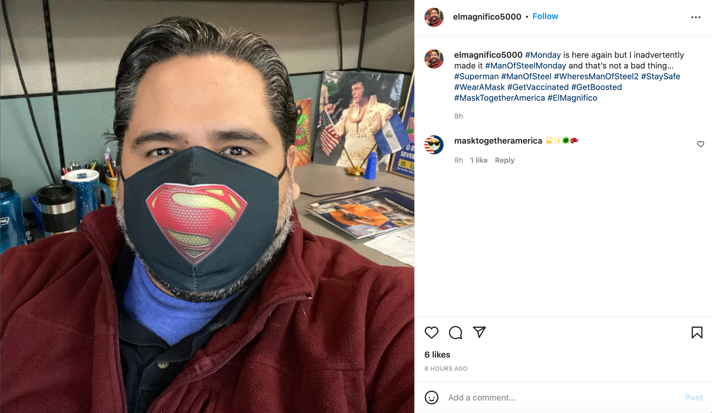 This is an Instagram post by elmagnifico5000. This post is of a man wearing a mask while showing something he is interested in with it. In the hashtags, he is encouraging people to stay safe, get boosted, and for others to wear masks.