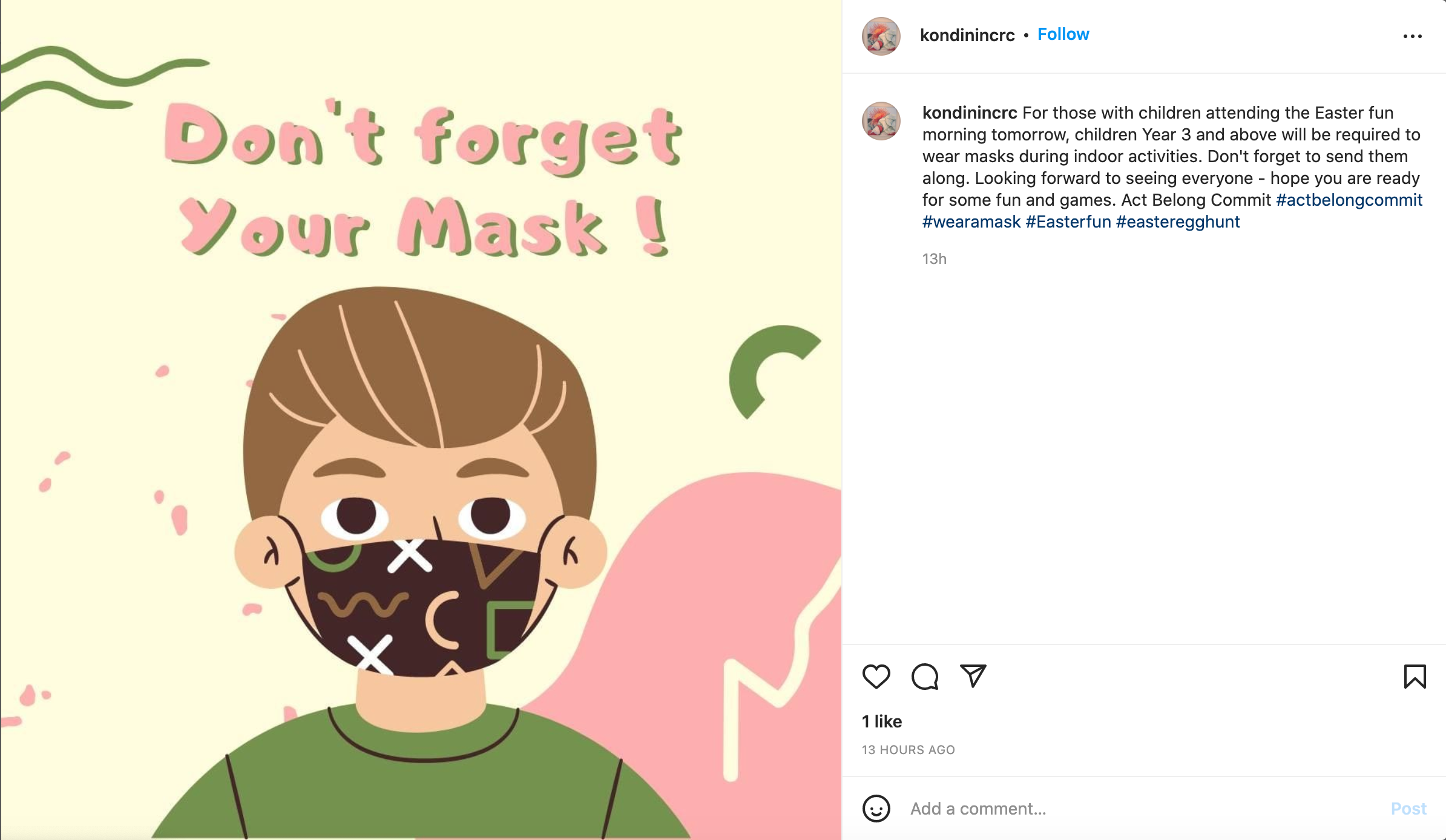 This is an Instagram post by kondinincrc. This is a post about an upcoming Easter egg hunt for kids. It says that kids three and above are required to wear a mask. This is pretty normal for the time. Some places still require masks, while others do not. This has been an ongoing trend after 2020 where restrictions are lifted for certain things, but required for others. It is one of those aspects of the pandemic that have carried over for quite some time.
