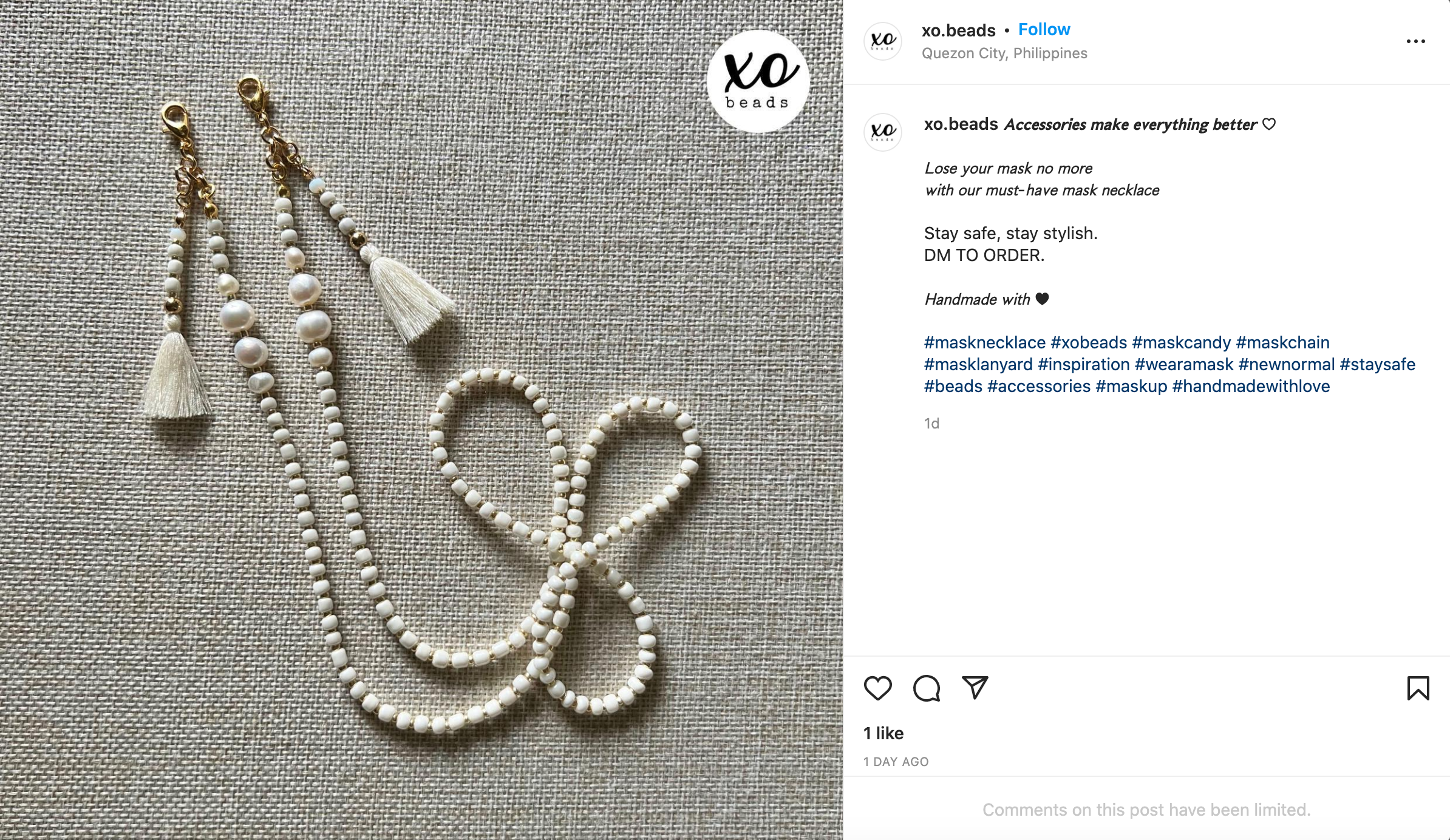 This is an Instagram post by xo.beads. Since the start of the pandemic, some companies have taken advantage of people needing to wear masks and designed accessories to go with them. One accessory that has been sold in some stores are mask necklaces, which are similar to glasses chains that some already wear. They are made to look good with an outfit, while making sure you can keep track of your mask better. These accessories can range from very expensive, with some well-known designers making masks and mask accessories, to the very cheap. It is one of the new trends that have come about since the pandemic.