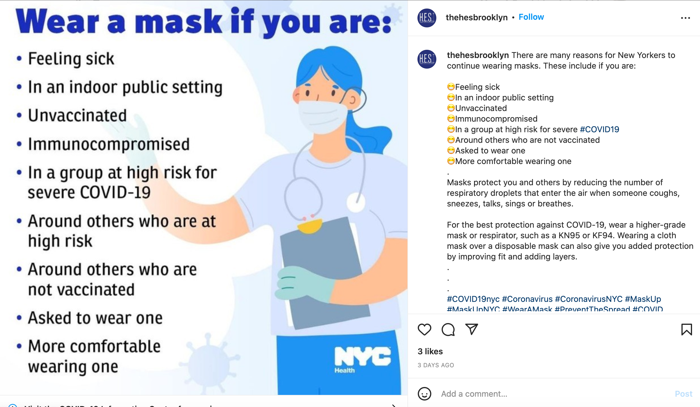 This is an Instagram post by thehesbrooklyn. This is a PSA advising you when you should wear a mask. Some of the things it say to wear a mask for include: feeling sick, indoor public settings, unvaccinated, immunocompromised, high risk group, around unvaccinated, etc. The first point I find the most interesting because it marks a change in culture due to the virus. Prior to the virus, people I know wouldn't really wear a mask if they felt sick. Now, if some are feeling under the weather, they will wear masks. Considering this is a PSA for New York City, it is a place with some that has had some restrictions much longer than other parts of the United States. According to a relevant article linked with this post, New York City did not drop most COVID restrictions until March 7, 2022. Comparatively, my own state of Arizona had most restrictions lifted on March 25, 2021. Though, much like New York City, some businesses still require masks out of their own choice. As we see here, this PSA for Brooklyn is encouraging people to still wear masks even if some restrictions have been lifted.