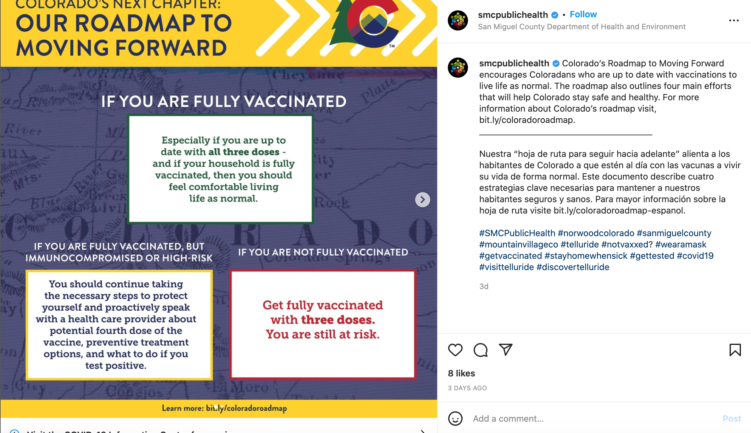 This is an Instagram post by smcpublichealth. This post is about vaccination status and the risks that they pose. Those unvaccinated are said to be highest risk. The immunocompromised are recommended to see a doctor about a fourth dose. If you are up to date on all vaccines and everyone else in the household is vaccinated, life can continue on as normal. In the hashtags below this post, it says to wear a mask, stay home when sick, and get tested.