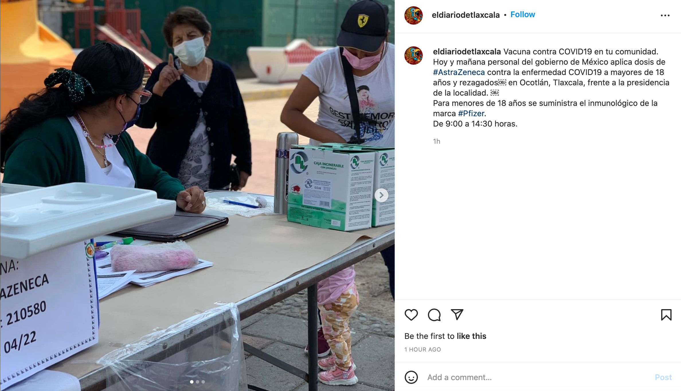 This is an Instagram post by eldiariodetlaxcala. This is written in Spanish and is about information for people to get the AstraZeneca vaccine. This event will be held for two days. In the picture, we see volunteers working to help administer the vaccine. Only people 18 and above are eligible for this vaccine, and it is being held in Ocotlán, Tlaxcala.
