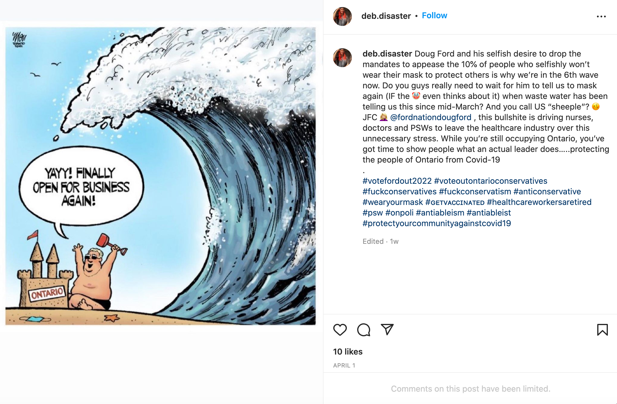 This is an Instagram post by deb.disaster. This user is criticizing the disaster that Doug Ford has created in Ontario regarding COVID restrictions. They believe that by lifting restrictions to cater to 10% of people in Canada that he is putting people in danger. The comic posted above shows a sandcastle (Ontario) built by Doug Ford and a giant wave (COVID) coming down to destroy it.