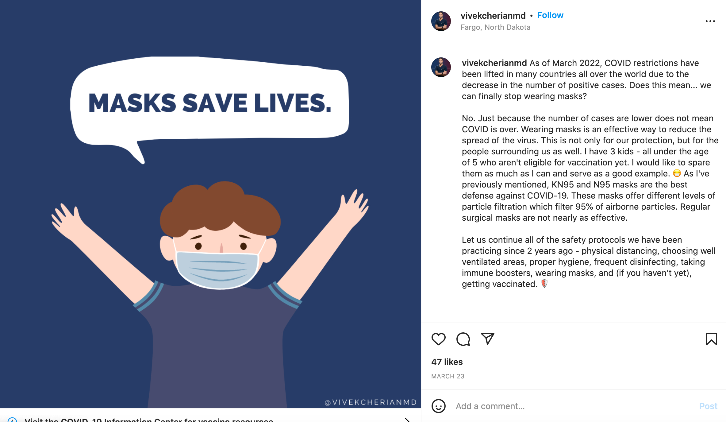 This is an Instagram post by vivekcherianmd. This post is by someone advising others to continue wearing masks despite a lot of the restrictions being lifted because young kids are not eligible to be vaccinated yet. This person recommends people use KN95 and N95 masks to best protect themselves. In the picture, we see an illustration of a kid in a mask saying "masks save lives."