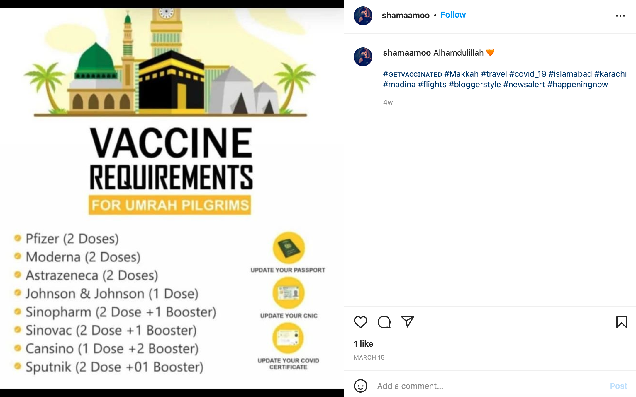 This is an Instagram post by shamaamoo. This is a PSA for vaccine requirements for those going on a pilgrimage. It shows a variety of vaccines that are accepted for this, as it includes many people from around the world. Pilgrimages have been affected by the virus since they include lots of travel and spaces with lots of people in one area.