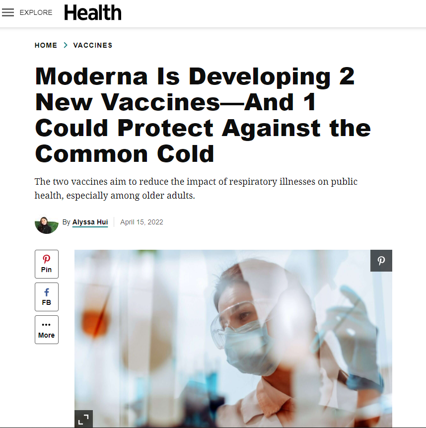 This is a news story by health.com written by Alyssa Hui. This story is about Moderna expanding its biotechnology into creating new vaccines using similar techniques the COVID vaccines have used. One of these vaccines will be used to help combat RSV, which is a virus that hospitalizes an average of 177,000 adults per year, according to the CDC.