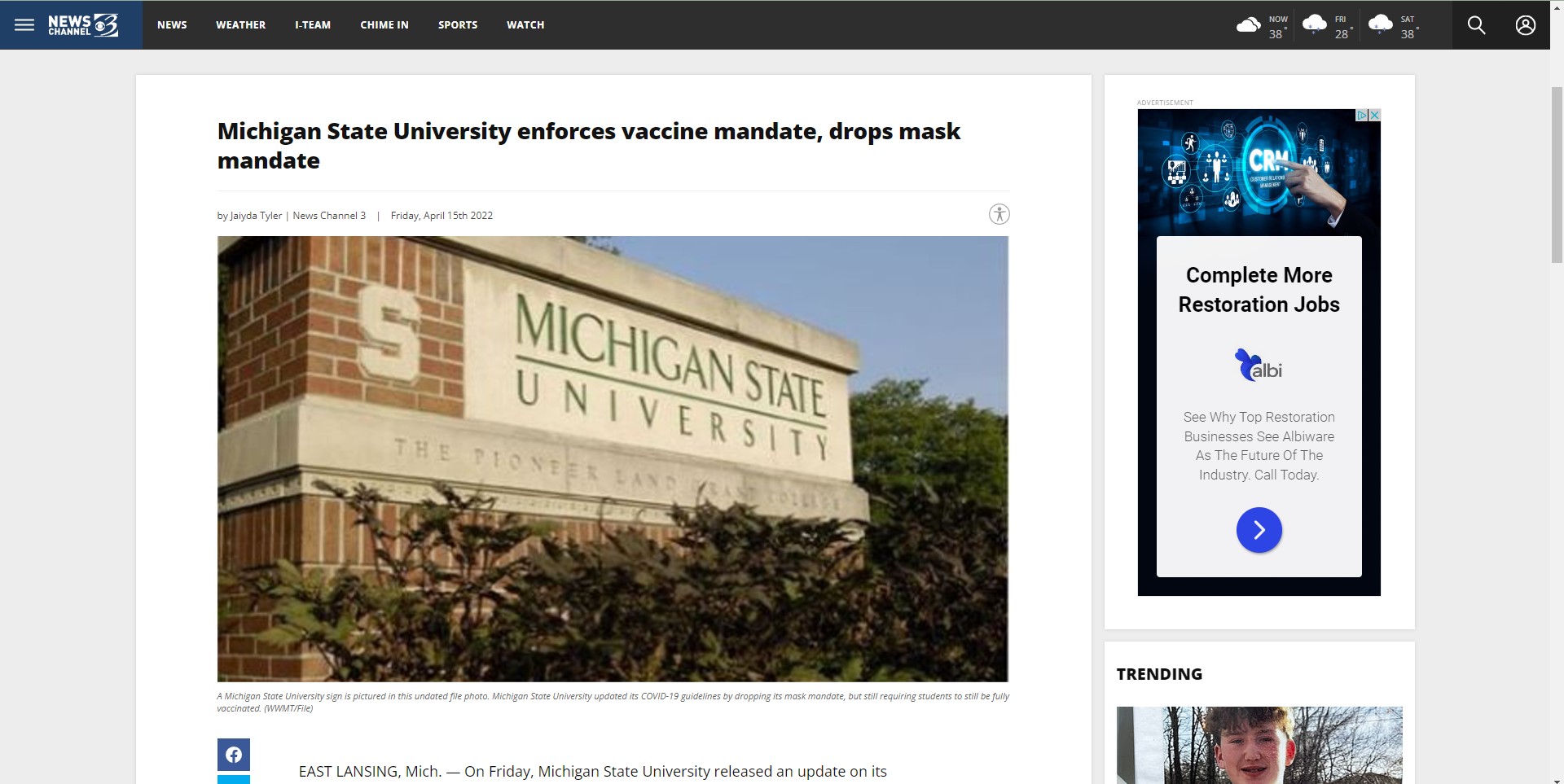 This is a text story from Channel 3 News by Jaiyda Tyler. This is about Michigan State University and the mandates for that university. The university has decided to drop the mask mandate, but enforce the vaccine mandate. This new policy will require all participating in the 2022-2023 academic school year to be fully vaccinated and to have received a booster shot. This mandate will affect people participating in the summer 2022 session. All students that do not submit their vaccine information will be prevented from enrolling in the summer 2022 and fall 2022 sessions at MSU.