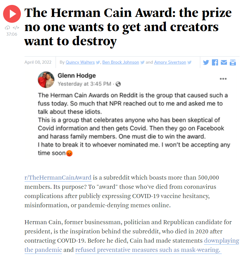 This is a news story from WBUR by Amory Sivertson, Ben Brock Johnson, and Quincy Walters. This is an interview that has been transcribed about the subreddit r/TheHermanCainAward. This subreddit has over 500,000 members. It is named after Herman Cain, a former businessman and Republican presidential candidate, who died in 2020 after getting the Coronavirus. One of the moderators, "Hammy", says that specific anti-mask and anti-vaccine people are featured on the subreddit in an attempt to influence, and in turn, take what is posted publicly, and throw it back in their faces. In order to get an "award" on the subreddit, one has to die. Nominations are for those that go to the hospital. The subreddit makes sure that all information is verified so people cannot call it "fake." They also go to lengths to black-out names, faces, and places in order to protect privacy. Though, even with attempts to make things anonymous, people are still found out. The moderator "Hammy" also does not wish to include their real name in this interview for fear of harassment. Glenn, someone that got featured in the subreddit, was also in this interview to explain his reasoning. Many of his doubts stem from the way the government has been handling it, in addition to the producers of the vaccine themselves asking for more boosters after the initial vaccine, which to him, doesn't seem normal for a vaccine. Glenn also recounts getting lots of harassment on his own Facebook page after getting featured in the subreddit, saying it isn't treatment their own kids should have to see, like people cheering on his death. Despite being vaccinated, "Hammy" contracted "long COVID." Glenn ended up with COVID pneumonia.