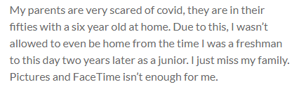 My parents are very scared of covid, they are in their fifties with a six year old at home. Due to this, I wasn’t allowed to even be home from the time I was a freshman to this day two years later as a junior. I just miss my family. Pictures and FaceTime isn’t enough for me.