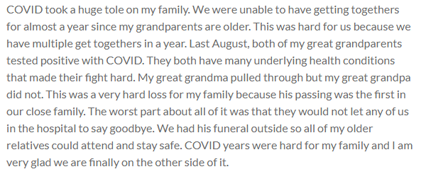 COVID took a huge tole on my family. We were unable to have getting togethers for almost a year since my grandparents are older. This was hard for us because we have multiple get togethers in a year. Last August, both of my great grandparents tested positive with COVID. They both have many underlying health conditions that made their fight hard. My great grandma pulled through but my great grandpa did not. This was a very hard loss for my family because his passing was the first in our close family. The worst part about all of it was that they would not let any of us in the hospital to say goodbye. We had his funeral outside so all of my older relatives could attend and stay safe. COVID years were hard for my family and I am very glad we are finally on the other side of it.