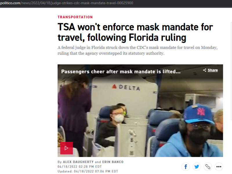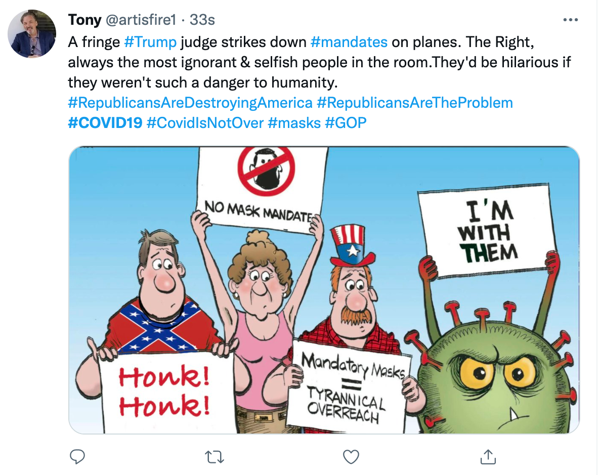 This is a Twitter update by artisfire1. This is about a judge striking down mandates on planes. Tony, otherwise known as atrisfire1, blames it on the selfishness of the right wing in the United States. The comic underneath that is posted helps demonstrate this person's feeling on the matter. The "I'm with them" sign held by an anthropomorphic coronavirus, is there with the anti-mandate crowd, making it apparent that the author of this tweet sees the anti-mandate crowd as the ones who spread the virus the most.