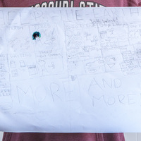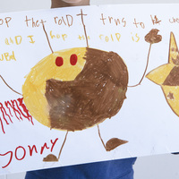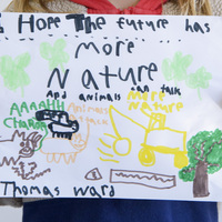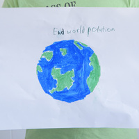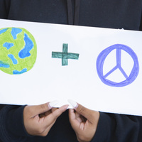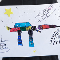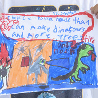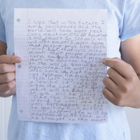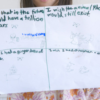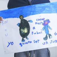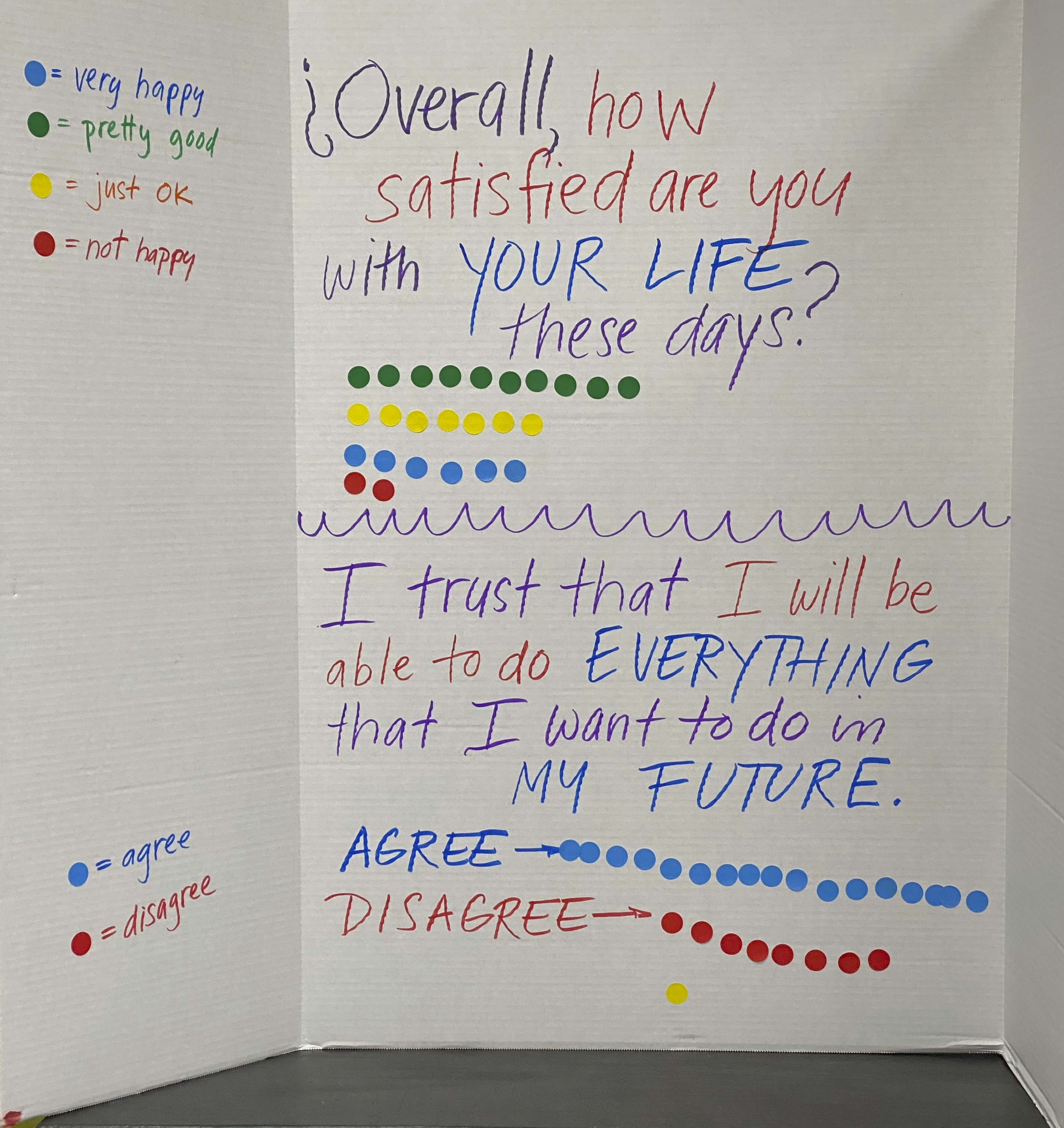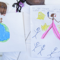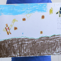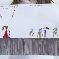 Using a grant from Civic Wellbeing Partners in Santa Monica, teachers at the Virginia Avenue Park Spring Camp program asked their students, from grades 1 through 8, to envision their hopes for the future. The students responded with drawings (and one story). Facilitated by artist Paula Goldman as part of SMhopes, the students were also asked to rank how happy they were with their lives now, and how they view their future prospects, two indicators of well being.