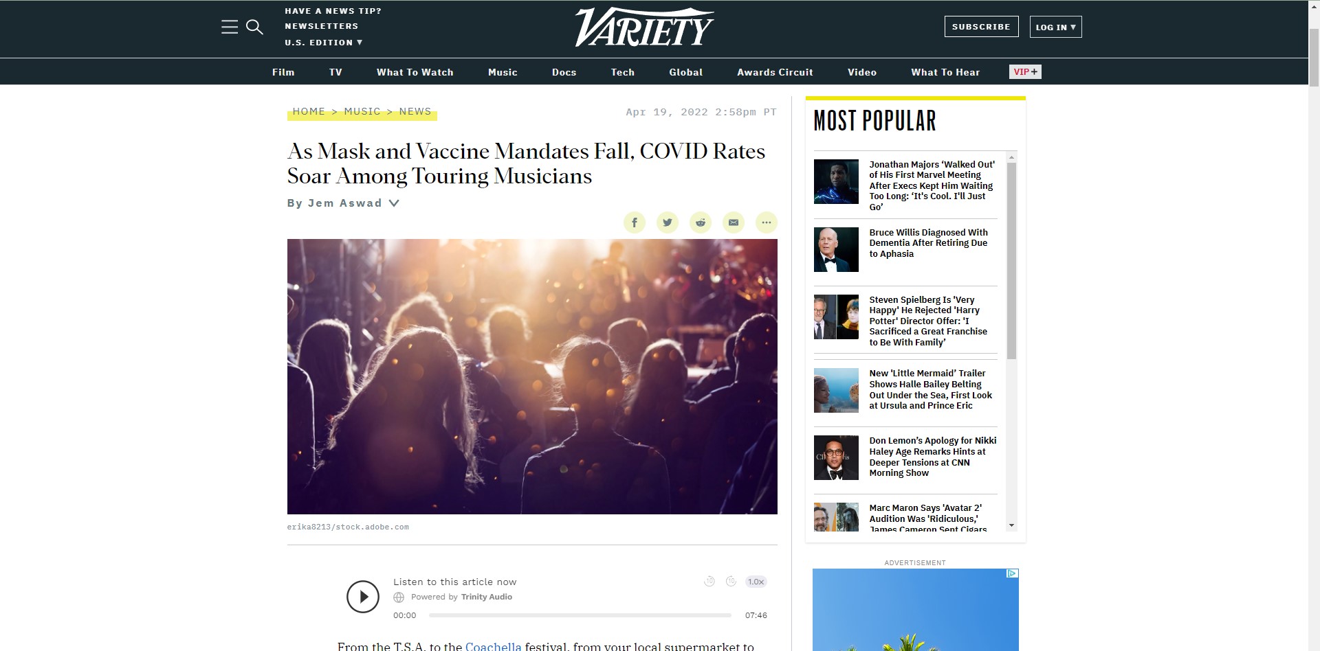 This is a news story from Variety by Jem Aswad. The author here is talking about rising COVID cases among touring musicians. She says that while no official data exists, social media posts from band members and musicians postponing or canceling concerts due to someone testing positive has been the way to find this data.