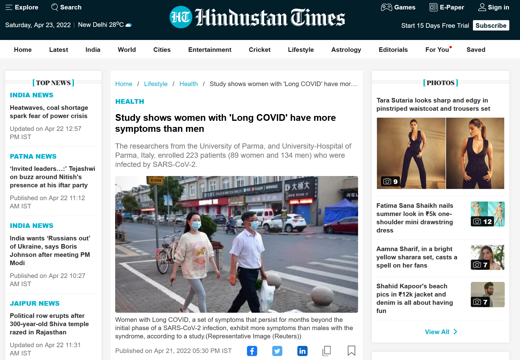 This is a news story from the Hindustan Times. There has been a study showing that women tend to be affected more by 'Long COVID' symptoms than men do. The research was published in the Journal of Women's Health. In the study, women are more likely to have fatigue, difficulty swallowing, and chest pain after a COVID infection compared to men.