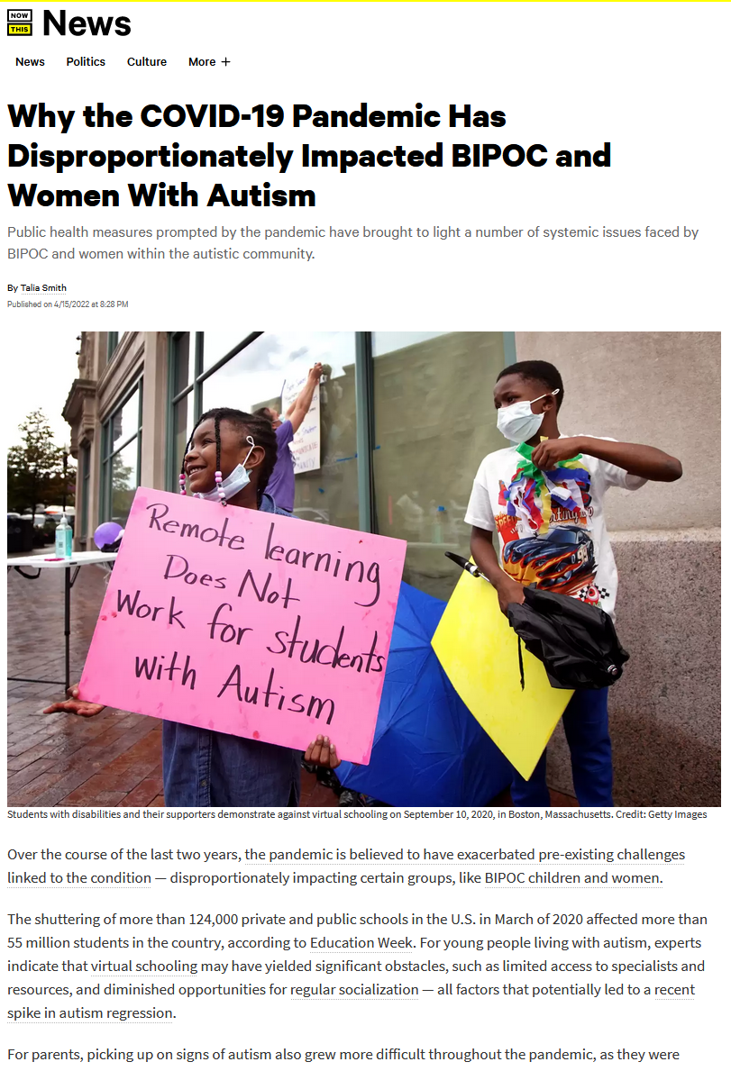 This is a news story from Now This News by Talia Smith. The author says that over the course of the pandemic, BIPOC and autistic women have been disproportionately affected. BIPOC parents who were not able to work remotely struggled to support their autistic children.