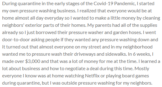 During quarantine in the early stages of the Covid-19 Pandemic, I started my own pressure washing business. I realized that everyone would be at home almost all day everyday so I wanted to make a little money by cleaning neighbors' exterior parts of their homes. My parents had all of the supplies already so I just borrowed their pressure washer and garden hoses. I went door-to-door asking people if they wanted any pressure washing down and it turned out that almost everyone on my street and in my neighborhood wanted me to pressure wash their driveways and sidewalks. In 6 weeks, I made over $3,000 and that was a lot of money for me at the time. I learned a lot about business and how to negotiate a deal during this time. Mostly everyone I know was at home watching Netflix or playing board games during quarantine, but I was outside pressure washing for my neighbors.
