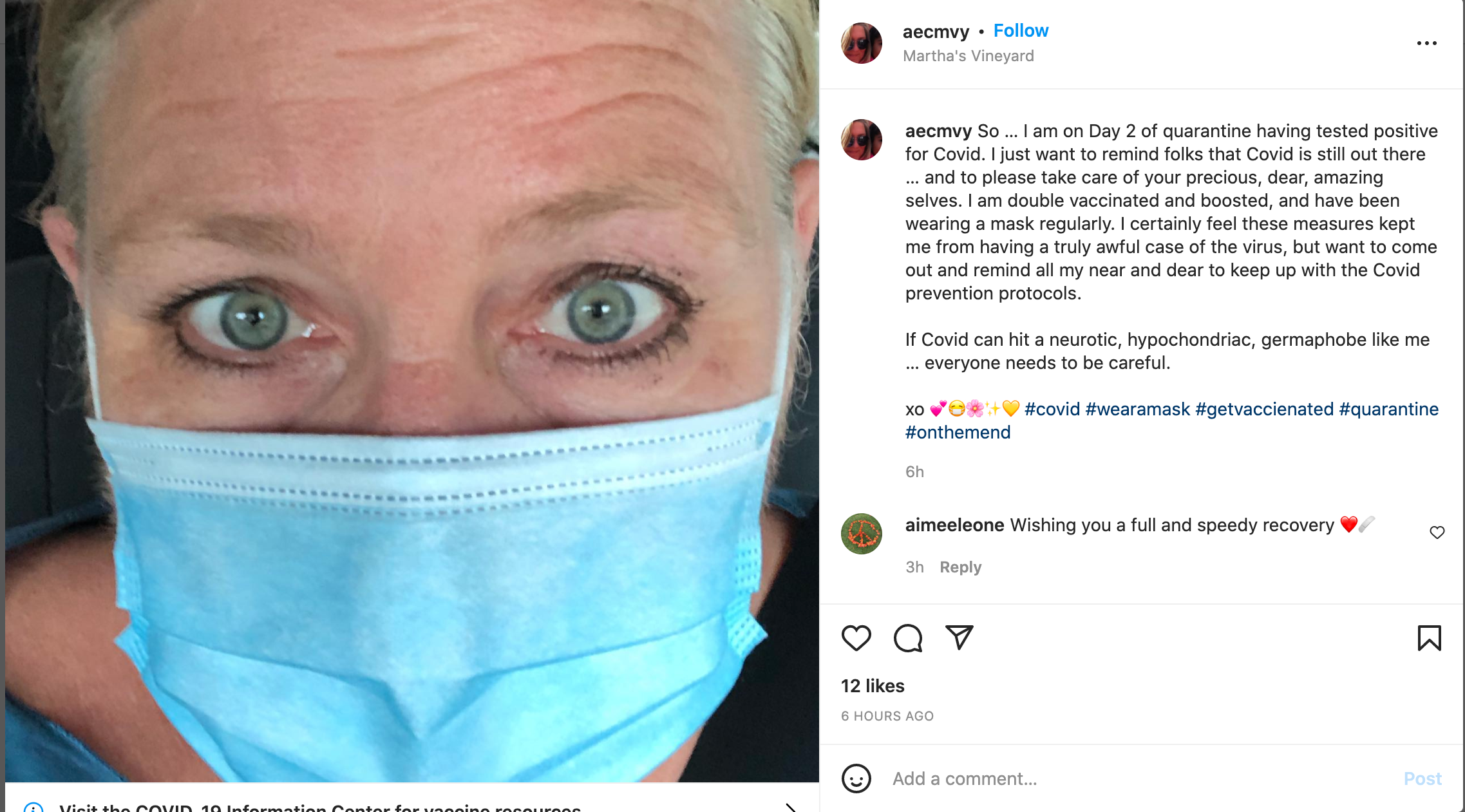 This is an Instagram post by aecmvy. This person is reminding everyone that COVID is still out there. Right now, she is quarantining. In the hashtags, she advises people to wear a mask, get vaccinated, and quarantine.