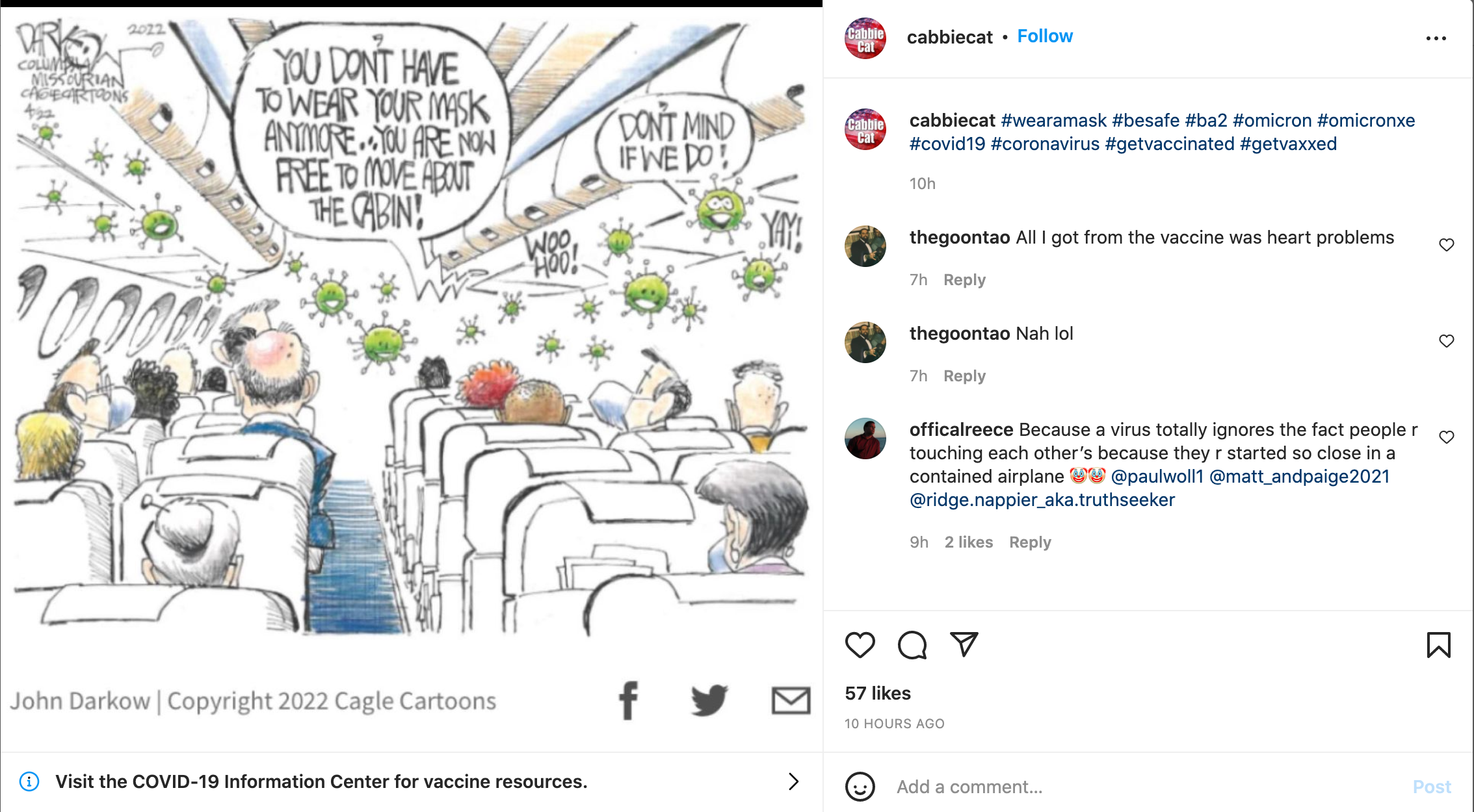 This is an Instagram post by cabbiecat. This user posted a comic that is referencing the recent lift on plane mask mandates in the United States. The comic itself is suggesting that by people removing their masks that COVID will spread easier.