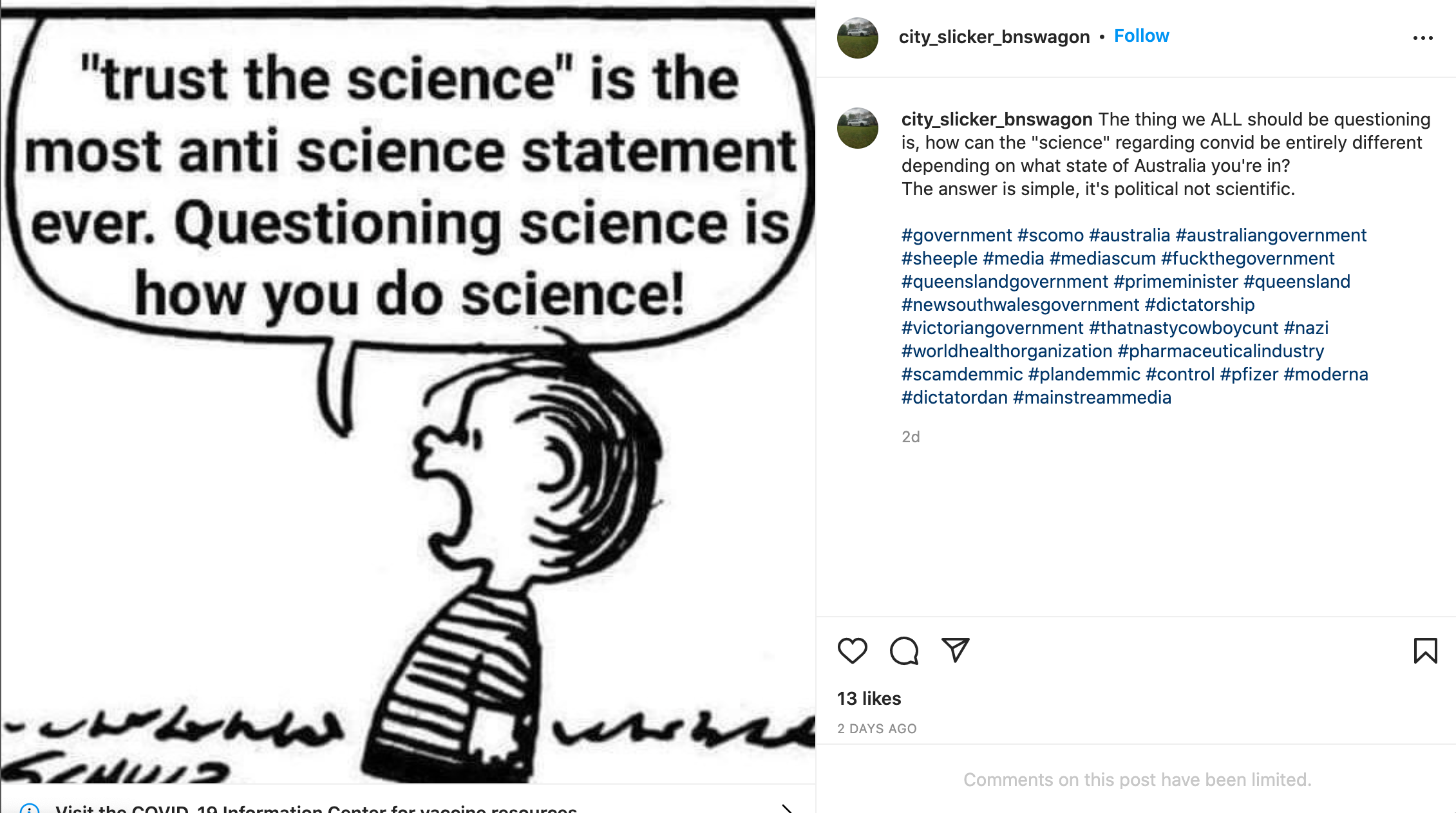 This is an Instagram post by city_slicker_bnswagon. This person is questioning the way we think of the science surrounding COVID. This person thinks that the virus is more political than it is about health.