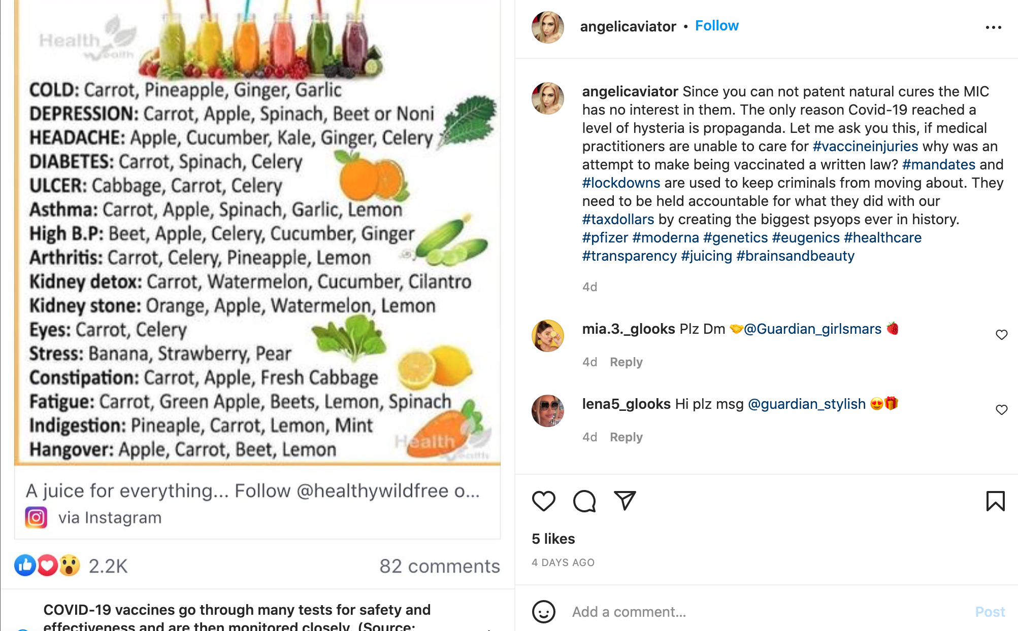This is an Instagram post by angelicaviator. This person suggests that more natural cures can help with COVID symptoms. Since natural cures don't make profit for the healthcare industry, this is why this person thinks that they are often overlooked. The picture that goes with this has types of juicing suggestions on what goes best against a certain ailment.
