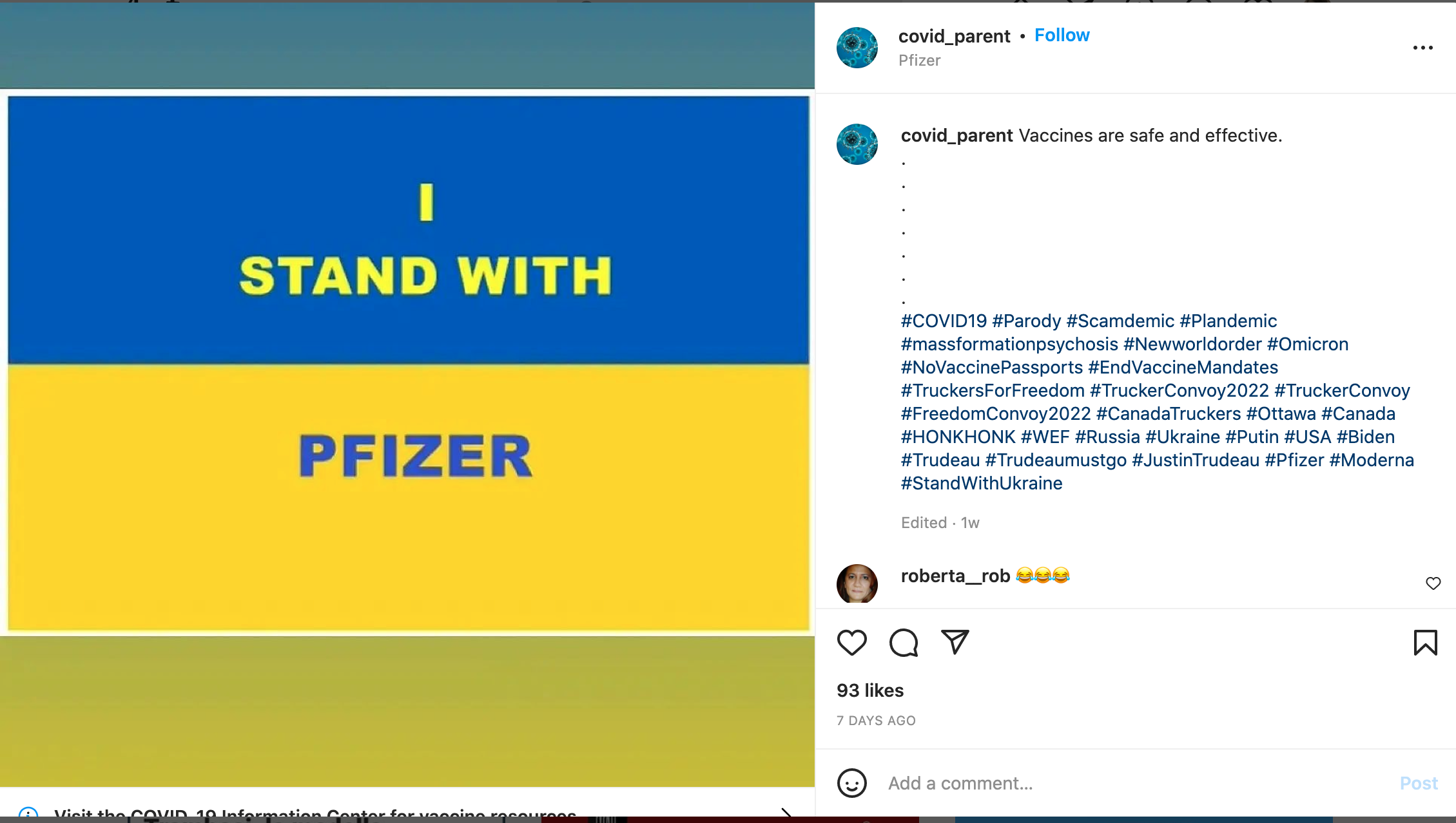This is an Instagram post by covid_parent. This is a parody of "I Stand with Ukraine" posts that have become popular over social media since the Russian invasion of Ukraine. Instead of saying that they stand with Ukraine, it is saying they stand with Pfizer, a pharmaceutical company. It is mocking the type of people that just follow any trend, whether it is vaccines, or which side to support in a war. The hashtags call the pandemic a "scamdemic" and references the "New World Order." These tags indicate the overall feeling that the pandemic is partly, or completely planned, in order to exert more control over people and limit their freedoms.