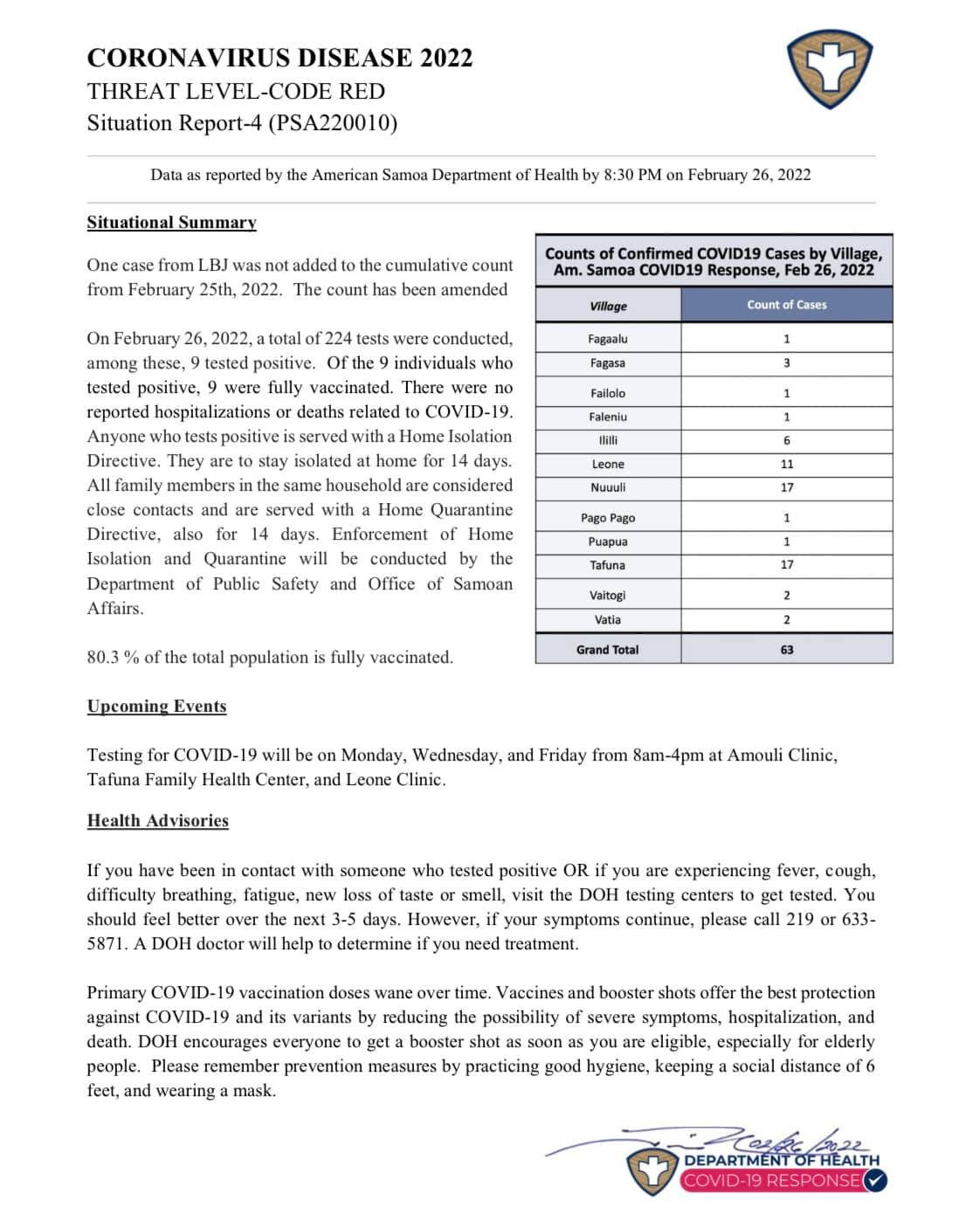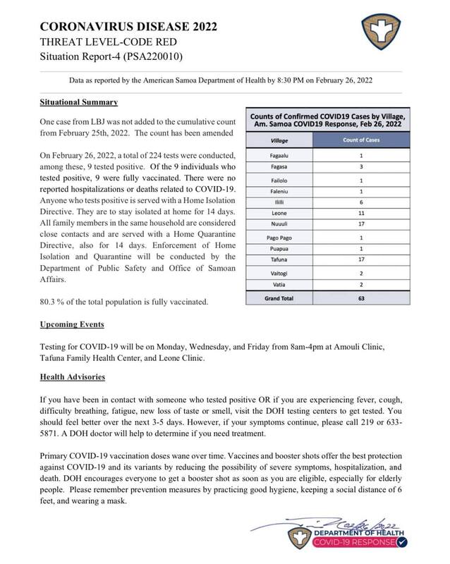 This is the third report on the COVID cases in American Samoa. The public is informed to get their vaccination and booster shots and to practice good hygiene social distance and wear masks. The number of cases is now 63.