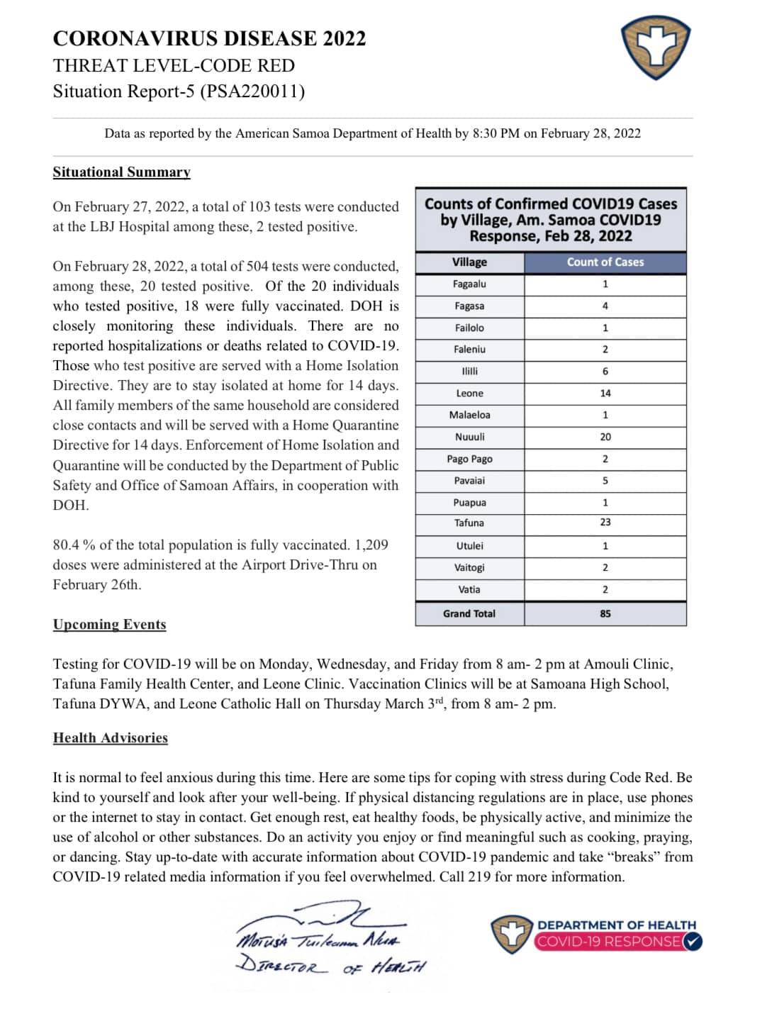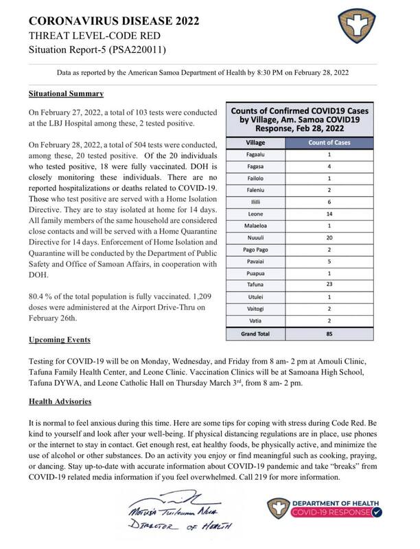 This is the fourth report released to the public by the Department of Public Health notifying the public of American Samoa of the number of cases that the island has as of February 27, 2022. From the past three reports, it seems as if from the past three days till now, the number of cases jumped from 22 to 85. While a summary is provided of the situation, upcoming events and health advisories are also included in the report for the public to continue to practice and where to get tested, vaccinated, or the booster shot.