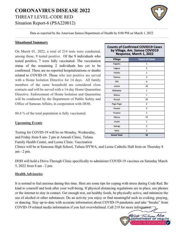 This is the fifth report released by the American Samoa Department of Public Health in regards to the rise of covid cases in American Samoa. As of March 1, 2022, positive cases have risen to 94 from 85 on February 28, 2022.