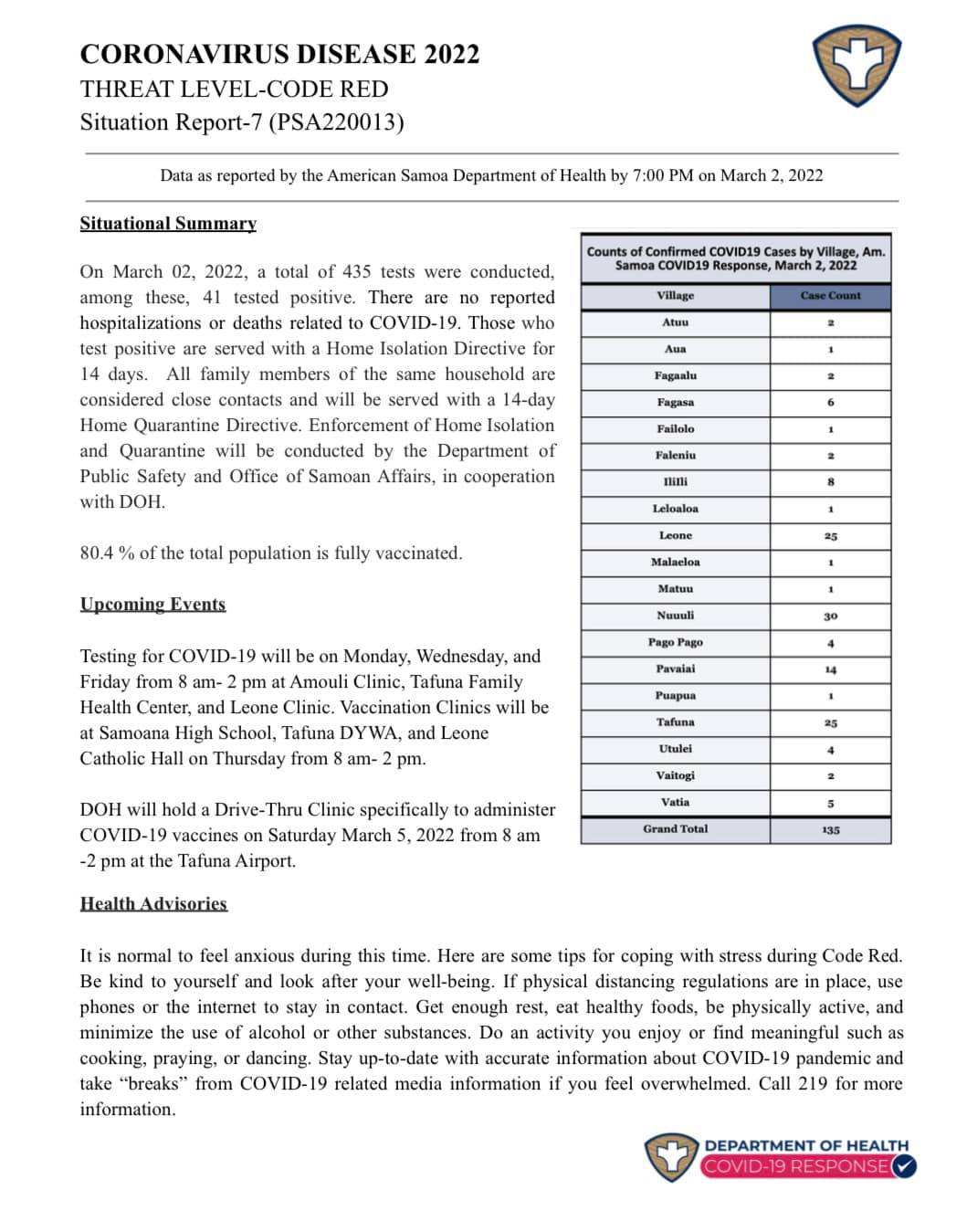 This is the sixth report released by the American Samoa Department of Public Health in regards to the rise of covid cases in American Samoa. As of March 2, 2022, positive cases have risen to 135 from 94 on March 1, 2022.