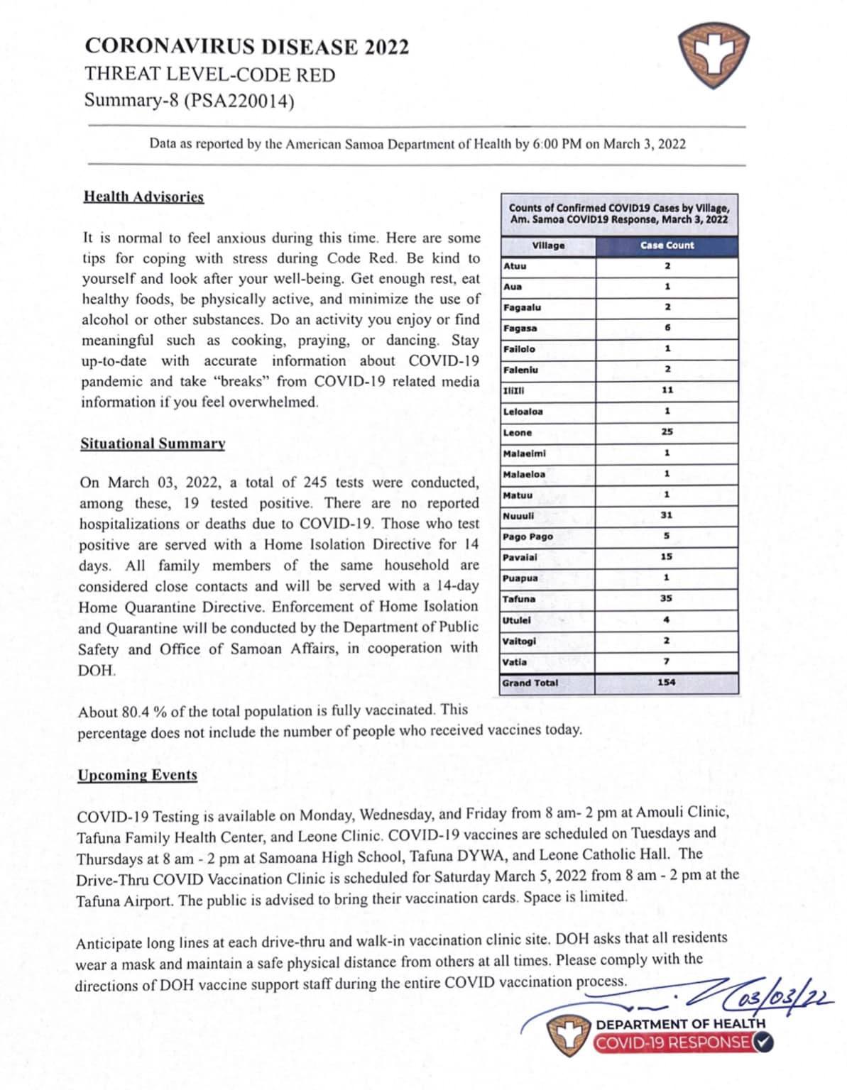 This is the seventh report released by the American Samoa Department of Public Health in regards to the rise of covid cases in American Samoa. As of March 3, 2022, positive cases have risen to 154 from 135 on March 2, 2022.