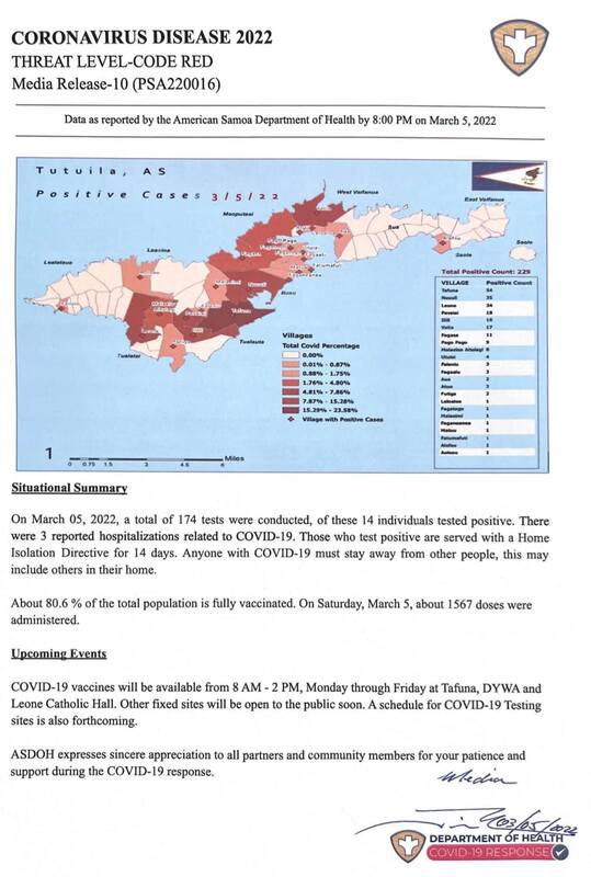 This is the ninth report released by the American Samoa Department of Public Health in regards to the rise of covid cases in American Samoa. As of March 5, 2022, positive cases have risen to 229 from 215 on March 4, 2022.