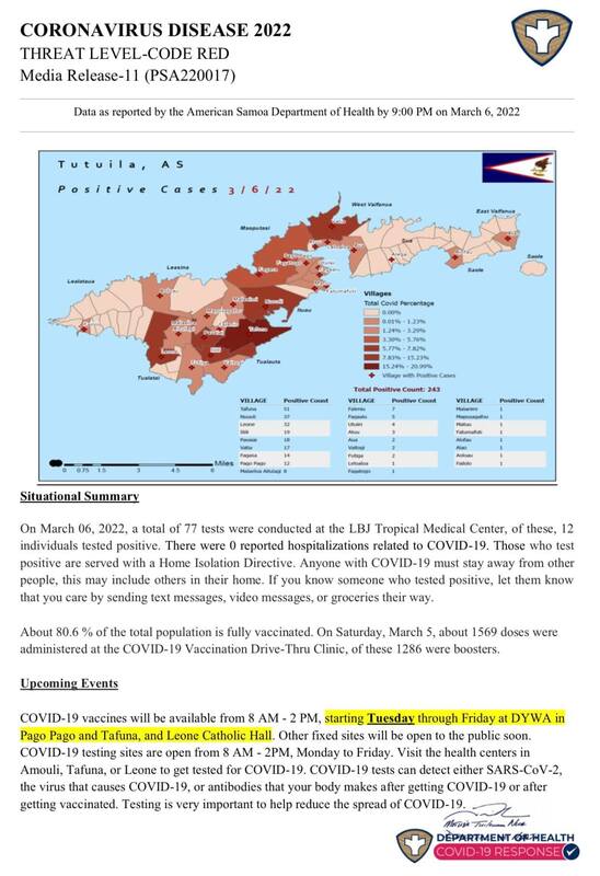 This is the tenth report released by the American Samoa Department of Public Health regarding the rise of covid cases in American Samoa. As of March 6, 2022, positive cases have risen to 243 from 229 on March 5, 2022. The people of American Samoa are still advised to get their vaccine shots and booster shot. And if they are to get tested, there are clinics on the East and West of the island to get tested if people are positive. The DOH released these reports daily or weekly to inform the public about the number of cases on the island.