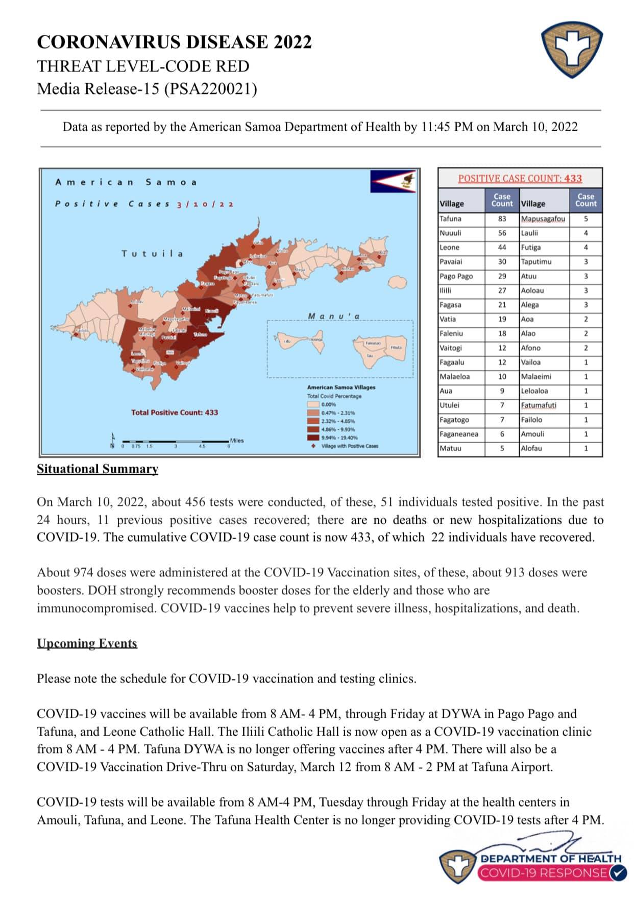 This is the thirteenth report released by the American Samoa Department of Public Health regarding the rise of covid cases in American Samoa. As of March 10, 2022, positive cases have risen to 433 from 343 on March 9, 2022. The DOH advised that elders are strongly recommended to get the booster shot.