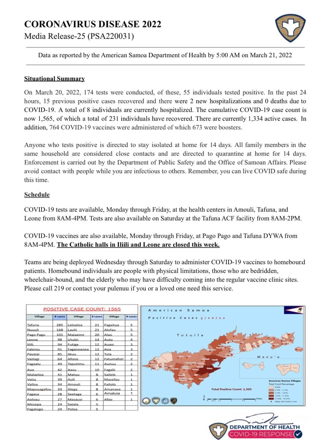 This is the fifteenth report released by the American Samoa Department of Public Health regarding the rise of covid cases in American Samoa. As of March 21, 2022, positive cases have risen to 1565 from 1188 on March 17, 2022.