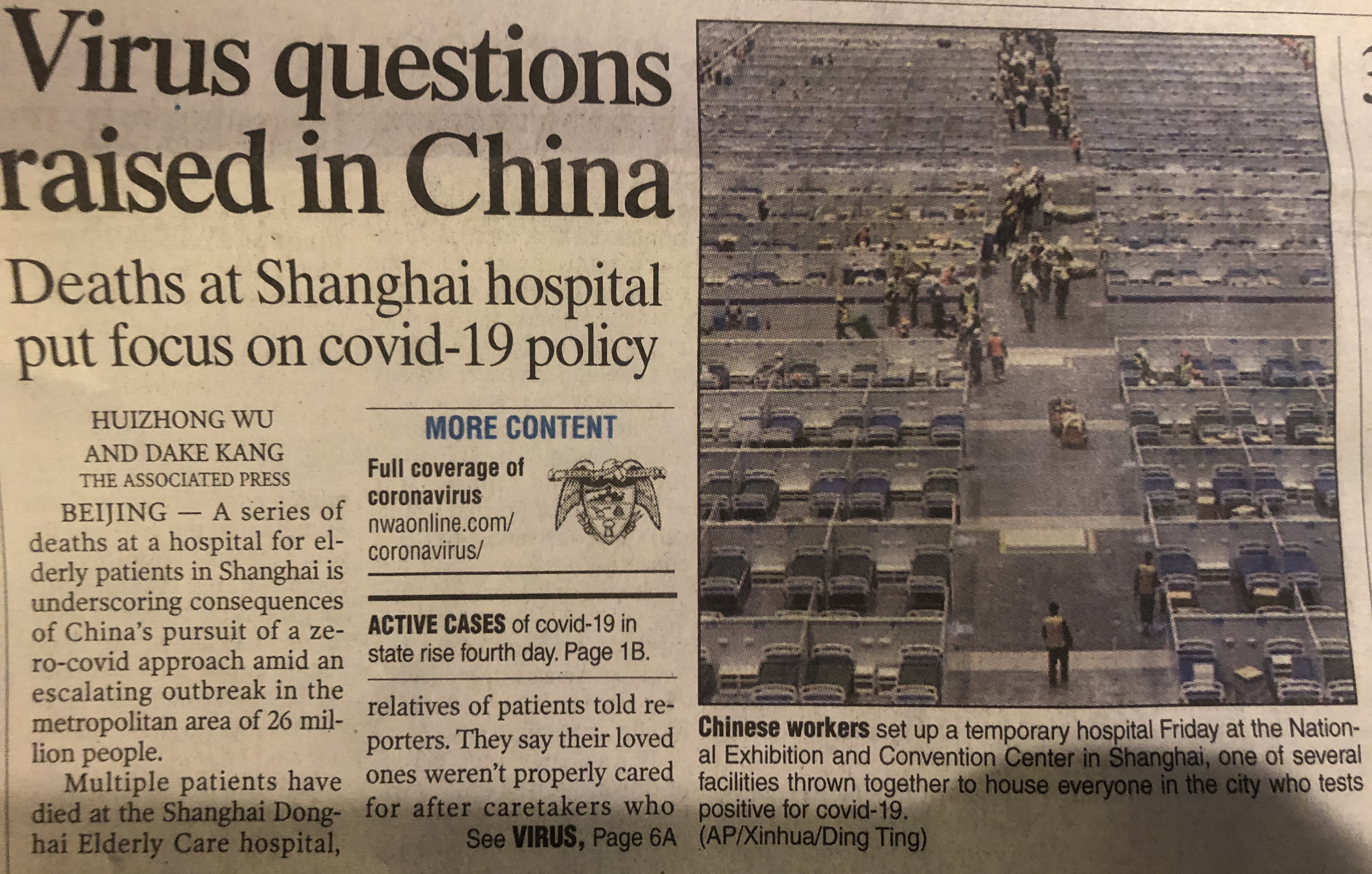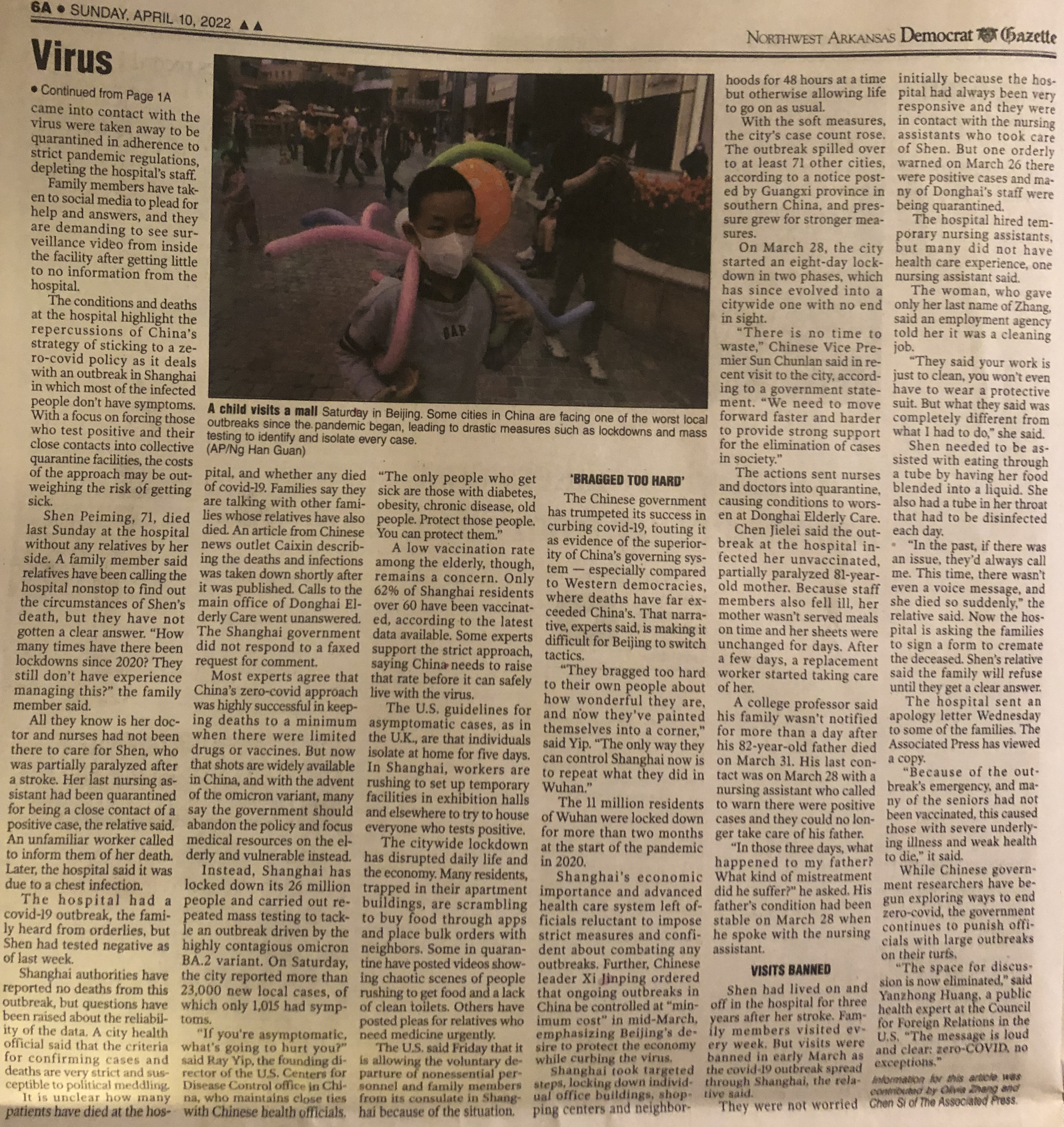 This is a newspaper article detailing the repercussions of China's "Zero-COVID" policy and the impact it has on families. The story reports a rise in deaths at a Shanghai hospital for the elderly and a further rise in COVID cases in Shanghai. Extensive regulations at the hospital have forced a decrease in hospital staff to manage the many elderly patients suffering with COVID. The article details that a significant number of patients are asymptomatic, yet are placed in strict quarantine to minimize the spread. There are reports of several patients dying due to a lack of proper care from medical professionals who are forced to be absent from the patient as they are locked in strict quarantine. The article further suggests that perhaps China's "Zero-COVID" policy approach is creating far more significant damage to individuals and their families than good.