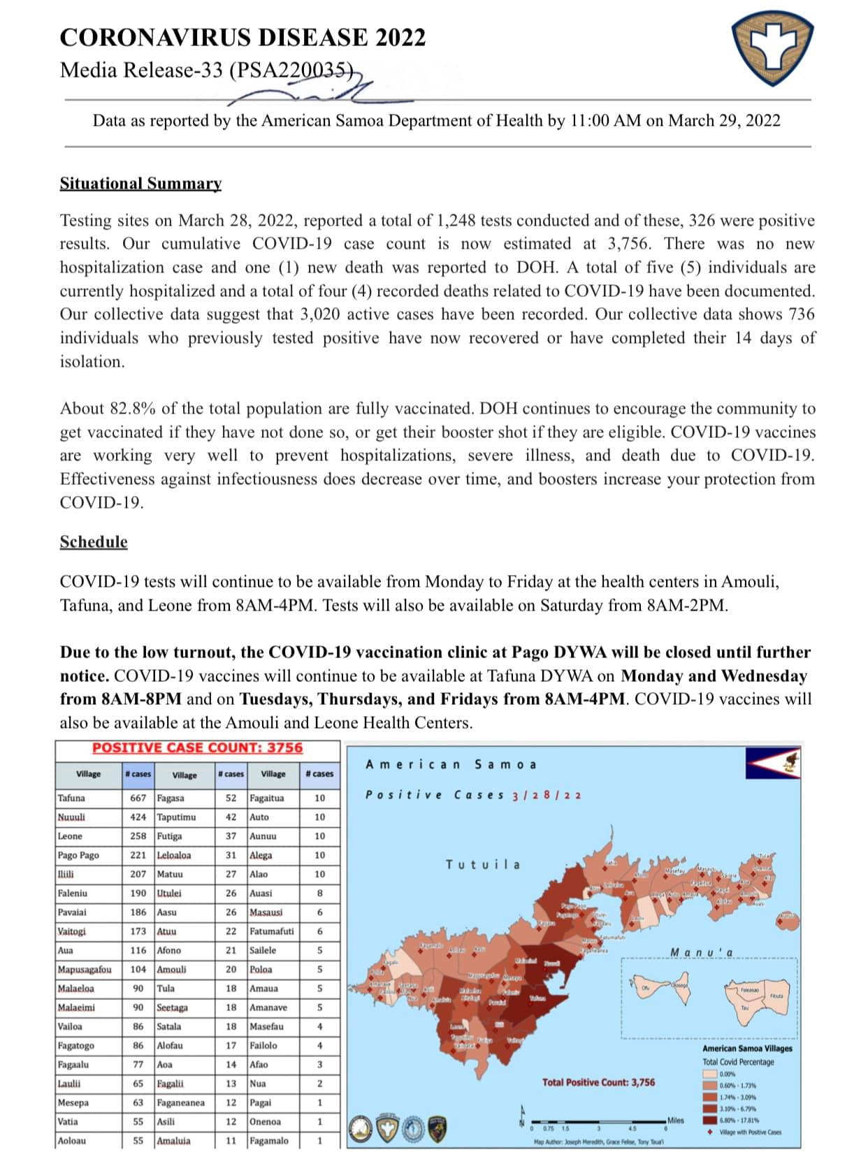 This is the nineteenth report released by the American Samoa Department of Public Health regarding the rise of covid cases in American Samoa. As of March 29, 2022, positive cases have risen to 3756 from 3381 on March 27, 2022. A total of five individuals are hospitalized and 4 recorded deaths related to COVID-19 have been documented.