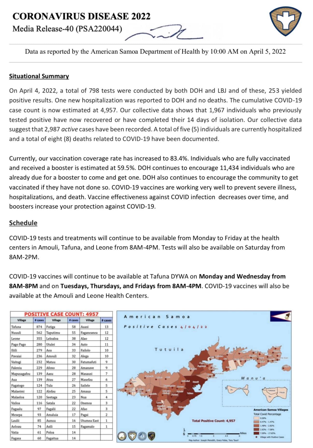 This is the twentieth report released by the American Samoa Department of Public Health regarding the rise of covid cases in American Samoa. As of April 05, 2022, positive cases have risen to 4957 from 3756 on March 29, 2022. A total of five individuals are hospitalized, and eight recorded deaths related to COVID-19 have been documented.