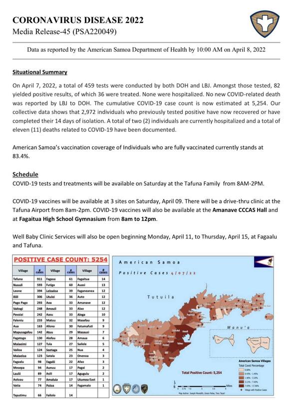 This is the twentieth-first report released by the American Samoa Department of Public Health regarding the rise of covid cases in American Samoa. As of April 08, 2022, positive cases have risen to 5254 from 4957 on April 05, 2022. A total of two individuals are hospitalized, and eleven recorded deaths related to COVID-19 have been documented. American Samo's vaccination coverage of individuals who are fully vaccinated currently stands at 83.4%.