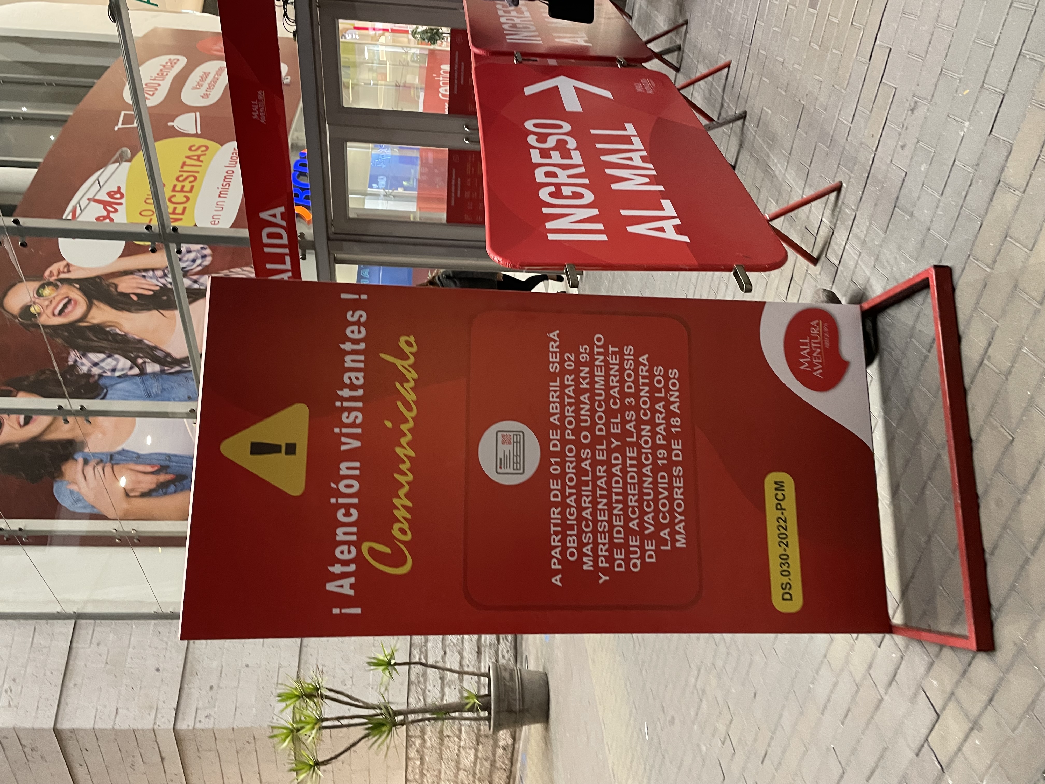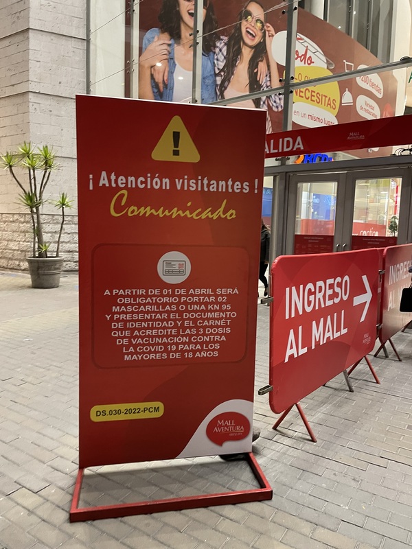 Outside the mall de Porongoche in Arequipa, Peru this signs lets people know that starting on April 1st, it is required to use 2 masks or an N-95 mask and present your ID and vaccine card (showing 3 doses) before entering the mall.