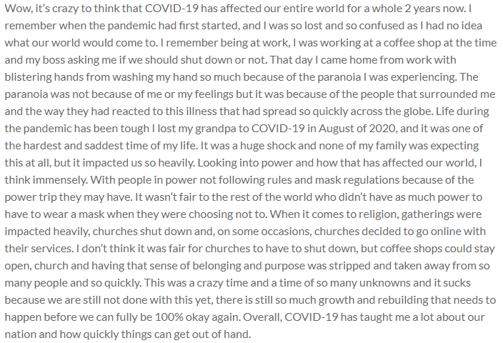 Wow, it’s crazy to think that COVID-19 has affected our entire world for a whole 2 years now. I remember when the pandemic had first started, and I was so lost and so confused as I had no idea what our world would come to. I remember being at work, I was working at a coffee shop at the time and my boss asking me if we should shut down or not. That day I came home from work with blistering hands from washing my hand so much because of the paranoia I was experiencing. The paranoia was not because of me or my feelings but it was because of the people that surrounded me and the way they had reacted to this illness that had spread so quickly across the globe. Life during the pandemic has been tough I lost my grandpa to COVID-19 in August of 2020, and it was one of the hardest and saddest time of my life. It was a huge shock and none of my family was expecting this at all, but it impacted us so heavily. Looking into power and how that has affected our world, I think immensely. With people in power not following rules and mask regulations because of the power trip they may have. It wasn’t fair to the rest of the world who didn’t have as much power to have to wear a mask when they were choosing not to. When it comes to religion, gatherings were impacted heavily, churches shut down and, on some occasions, churches decided to go online with their services. I don’t think it was fair for churches to have to shut down, but coffee shops could stay open, church and having that sense of belonging and purpose was stripped and taken away from so many people and so quickly. This was a crazy time and a time of so many unknowns and it sucks because we are still not done with this yet, there is still so much growth and rebuilding that needs to happen before we can fully be 100% okay again. Overall, COVID-19 has taught me a lot about our nation and how quickly things can get out of hand.