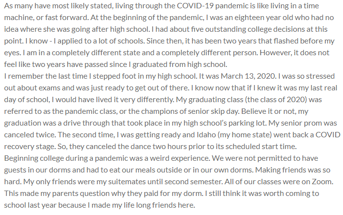As many have most likely stated, living through the COVID-19 pandemic is like living in a time machine, or fast forward. At the beginning of the pandemic, I was an eighteen year old who had no idea where she was going after high school. I had about five outstanding college decisions at this point. I know - I applied to a lot of schools. Since then, it has been two years that flashed before my eyes. I am in a completely different state and a completely different person. However, it does not feel like two years have passed since I graduated from high school.