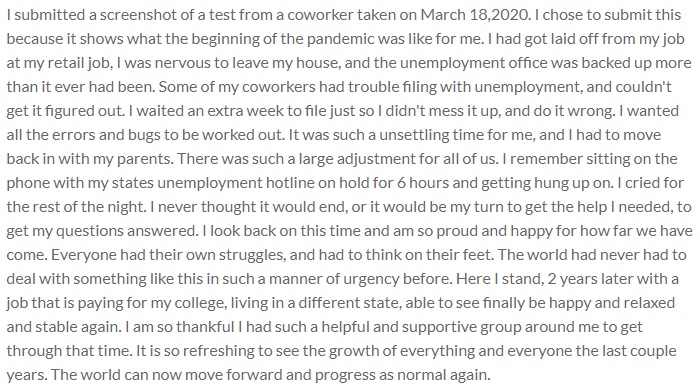 I submitted a screenshot of a test from a coworker taken on March 18,2020. I chose to submit this because it shows what the beginning of the pandemic was like for me. I had got laid off from my job at my retail job, I was nervous to leave my house, and the unemployment office was backed up more than it ever had been. Some of my coworkers had trouble filing with unemployment, and couldn't get it figured out. I waited an extra week to file just so I didn't mess it up, and do it wrong. I wanted all the errors and bugs to be worked out. It was such a unsettling time for me, and I had to move back in with my parents. There was such a large adjustment for all of us. I remember sitting on the phone with my states unemployment hotline on hold for 6 hours and getting hung up on. I cried for the rest of the night. I never thought it would end, or it would be my turn to get the help I needed, to get my questions answered. I look back on this time and am so proud and happy for how far we have come. Everyone had their own struggles, and had to think on their feet. The world had never had to deal with something like this in such a manner of urgency before. Here I stand, 2 years later with a job that is paying for my college, living in a different state, able to see finally be happy and relaxed and stable again. I am so thankful I had such a helpful and supportive group around me to get through that time. It is so refreshing to see the growth of everything and everyone the last couple years. The world can now move forward and progress as normal again.