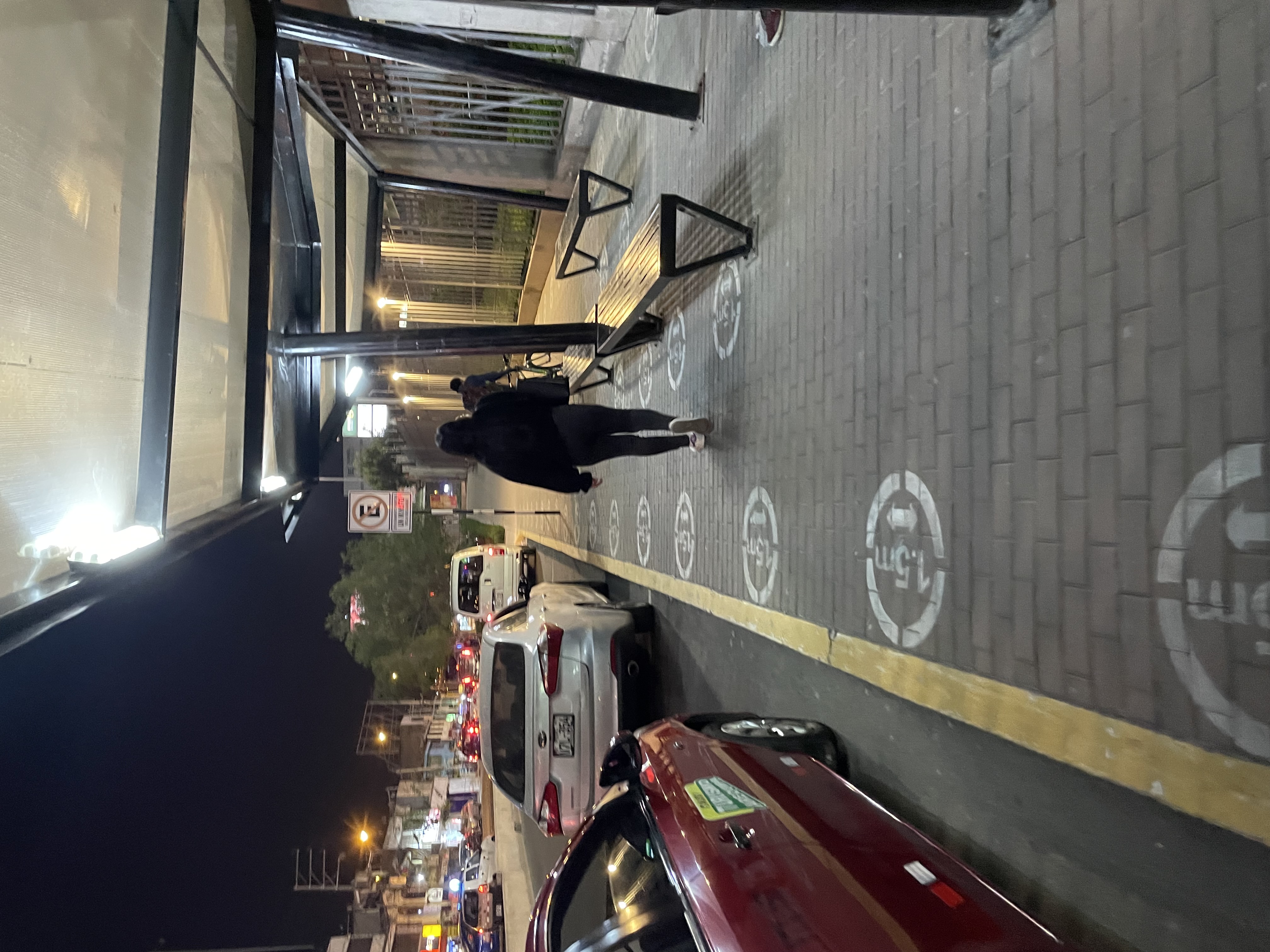 Marking on the ground indicating that people should keep 1.5m between themselves at a bus/taxi stop outside the Mall Porongoche