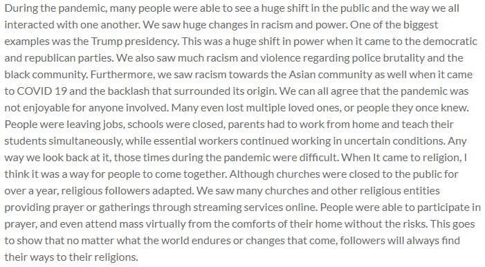 During the pandemic, many people were able to see a huge shift in the public and the way we all interacted with one another. We saw huge changes in racism and power. One of the biggest examples was the Trump presidency. This was a huge shift in power when it came to the democratic and republican parties. We also saw much racism and violence regarding police brutality and the black community. Furthermore, we saw racism towards the Asian community as well when it came to COVID 19 and the backlash that surrounded its origin. We can all agree that the pandemic was not enjoyable for anyone involved. Many even lost multiple loved ones, or people they once knew. People were leaving jobs, schools were closed, parents had to work from home and teach their students simultaneously, while essential workers continued working in uncertain conditions. Any way we look back at it, those times during the pandemic were difficult. When It came to religion, I think it was a way for people to come together. Although churches were closed to the public for over a year, religious followers adapted. We saw many churches and other religious entities providing prayer or gatherings through streaming services online. People were able to participate in prayer, and even attend mass virtually from the comforts of their home without the risks. This goes to show that no matter what the world endures or changes that come, followers will always find their ways to their religions.