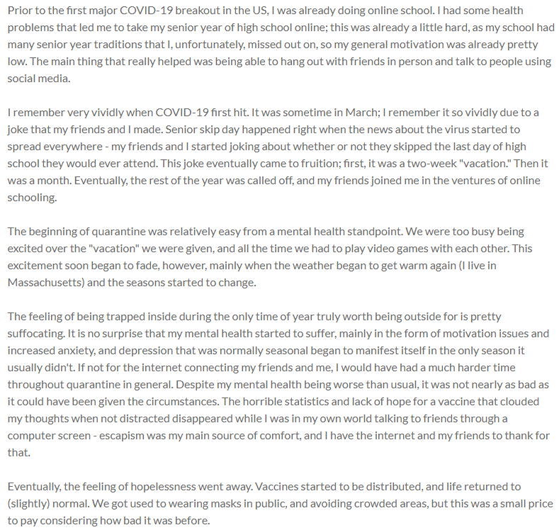 Prior to the first major COVID-19 breakout in the US, I was already doing online school. I had some health problems that led me to take my senior year of high school online; this was already a little hard, as my school had many senior year traditions that I, unfortunately, missed out on, so my general motivation was already pretty low. The main thing that really helped was being able to hang out with friends in person and talk to people using social media.
