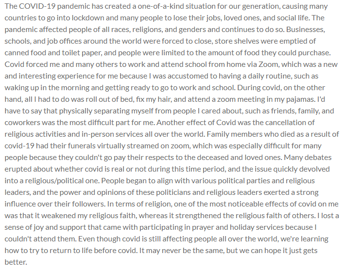 The COVID-19 pandemic has created a one-of-a-kind situation for our generation, causing many countries to go into lockdown and many people to lose their jobs, loved ones, and social life. The pandemic affected people of all races, religions, and genders and continues to do so. Businesses, schools, and job offices around the world were forced to close, store shelves were emptied of canned food and toilet paper, and people were limited to the amount of food they could purchase. Covid forced me and many others to work and attend school from home via Zoom, which was a new and interesting experience for me because I was accustomed to having a daily routine, such as waking up in the morning and getting ready to go to work and school. During covid, on the other hand, all I had to do was roll out of bed, fix my hair, and attend a zoom meeting in my pajamas. I'd have to say that physically separating myself from people I cared about, such as friends, family, and coworkers was the most difficult part for me. Another effect of Covid was the cancellation of religious activities and in-person services all over the world. Family members who died as a result of covid-19 had their funerals virtually streamed on zoom, which was especially difficult for many people because they couldn't go pay their respects to the deceased and loved ones. Many debates erupted about whether covid is real or not during this time period, and the issue quickly devolved into a religious/political one. People began to align with various political parties and religious leaders, and the power and opinions of these politicians and religious leaders exerted a strong influence over their followers. In terms of religion, one of the most noticeable effects of covid on me was that it weakened my religious faith, whereas it strengthened the religious faith of others. I lost a sense of joy and support that came with participating in prayer and holiday services because I couldn't attend them. Even though covid is still affecting people all over the world, we're learning how to try to return to life before covid. It may never be the same, but we can hope it just gets better.