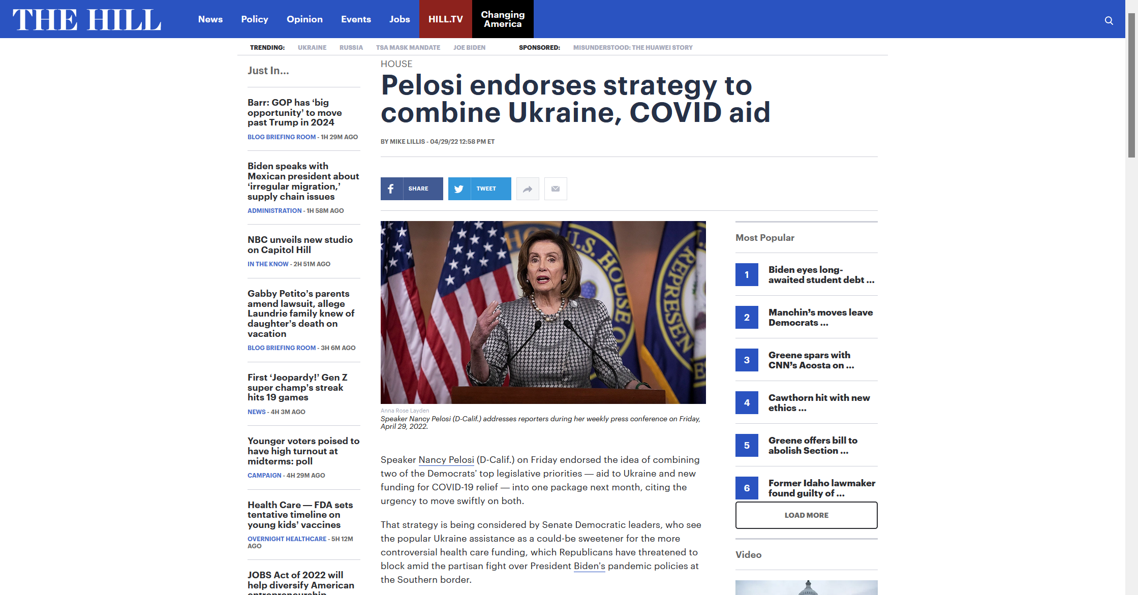 This is a news story from The Hill by Mike Lillis. This is about House Speaker Nancy Pelosi combining COVID aid with Ukraine aid into one package. This strategy is intended to help Congress pass the spending needed for Ukraine for the war. Currently, the CDC has said that overall need for aid has diminished as cases keep going down, with more guidelines being removed.