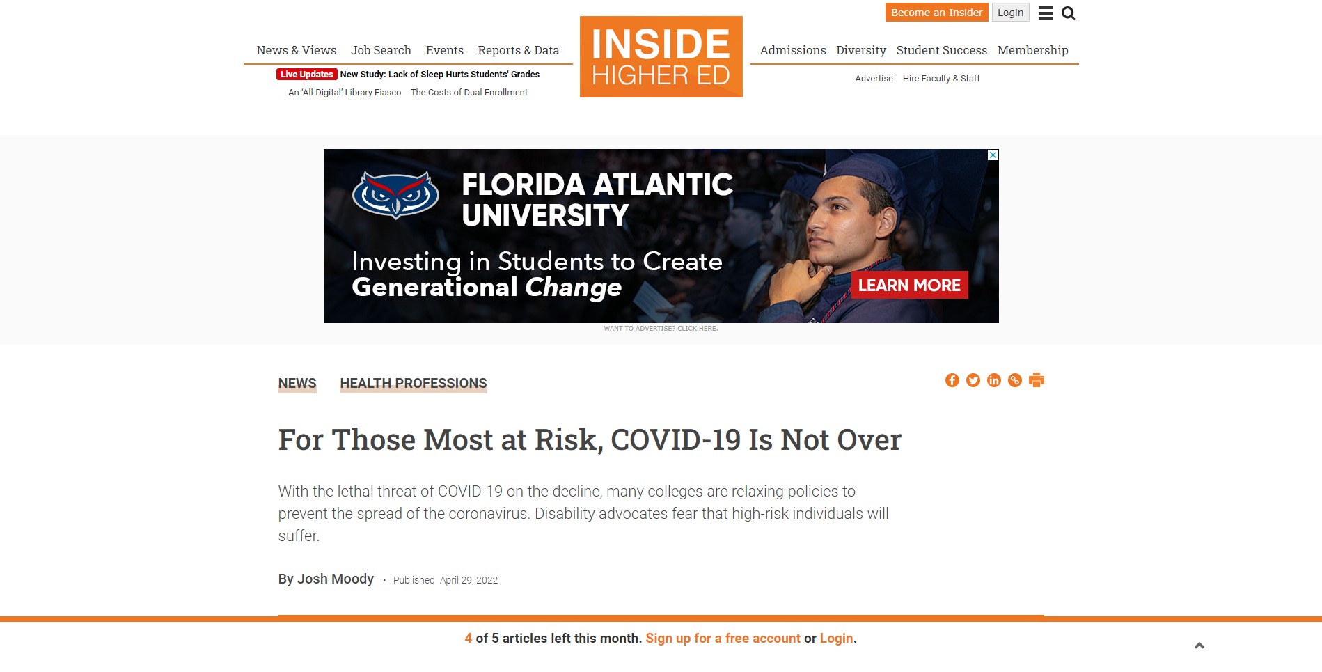 This is a news story from Inside Higher ED by Josh Moody. As schools begin to resume to pre-COVID standards, not all are happy with this change. Those with disabilities worry about the loosening guidelines and how it would affect their health. COVID rates vary across the country, but many colleges are starting to drop protocols. Some disability advocates claim that this is a wrong decision from the colleges doing this, as it is putting people at high risk in more danger.