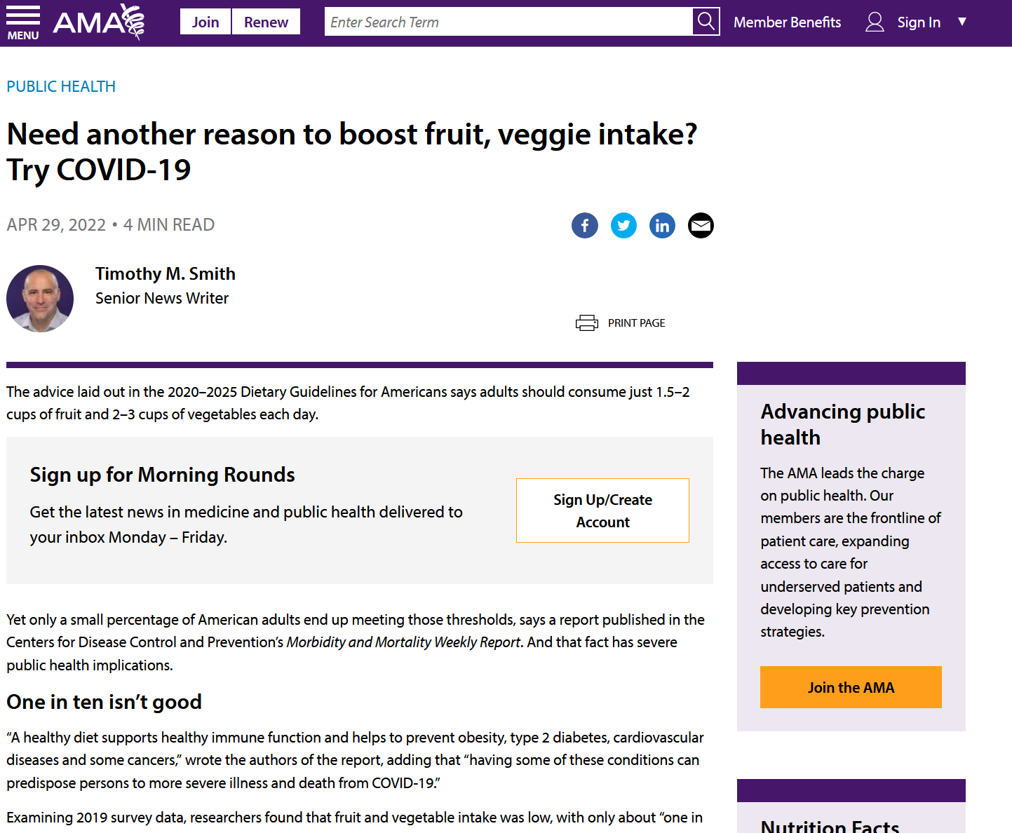 This is a news story from the American Medical Association by Timothy M. Smith. Doctors mentioned in this article bring up the importance of diet and how it relates to fighting off COVID-19. According to a 2019 survey, researchers found only 1 in 10 adults meet the daily recommended intake of fruit and vegetables.
